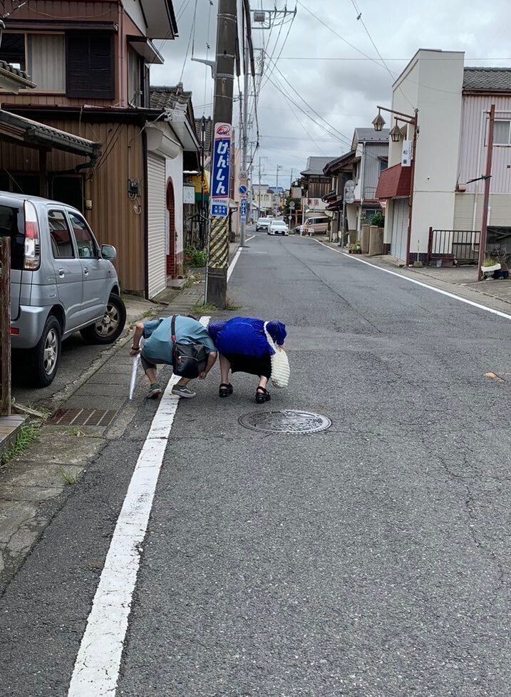 「大洗の有名なお寿司屋さんに3人で並んでいたところ、写真右側から野良猫が現れ、道路を横切って左側の車の下に入っていきました。私も、写真に写っている友人も猫がとても好きだったので、思わず車の下をのぞき込んだのがこの瞬間です」