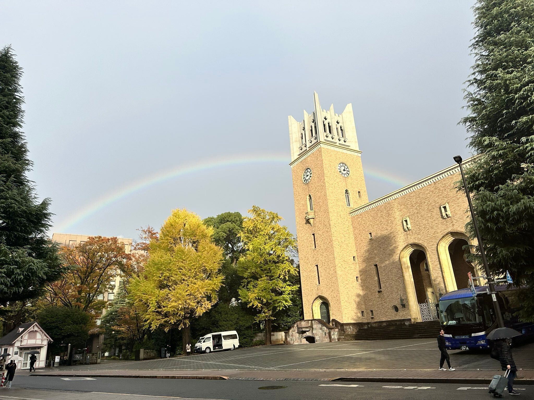 「先生自身も少し遅れてきたらしく、教室にくるなり『虹見た?虹』と履修者に呼びかけていたと聞きました。詳しい状況はわかりませんが、教室の一面が全面窓になっているので、そこに集まって虹を見たのかもしれません」