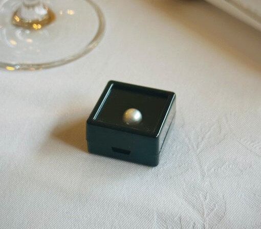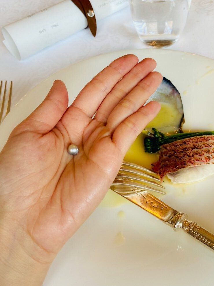 「『海の恵み』コースにある一品、『尾長鯛と真珠貝のヴァプール』を食べていたところ、妻が突然驚いた顔をしました。そして、口から真珠が出てきたのです。大粒でしっかりとした真珠だったので、二人でビックリして大笑いしました」