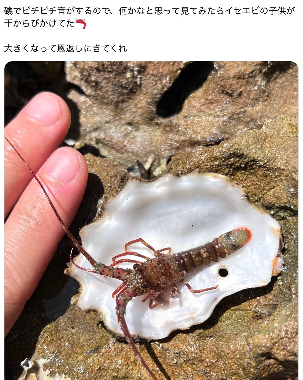 「磯でピチピチ音がするので、何かなと思って見てみたらイセエビの子どもが干からびかけてた」