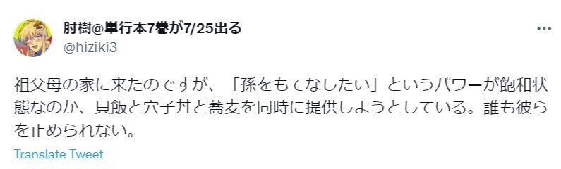 肘樹さんが祖父母の家に遊びに行くと、なんと貝飯と穴子丼と蕎麦という、炭水化物3品のおもてなしが待っていたそうです!