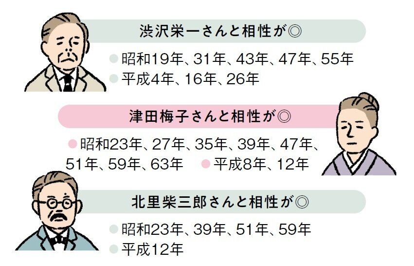 4.新紙幣の肖像画である渋沢栄一さん、津田梅子さん、北里柴三郎さんと相性がいいあなたの生まれ年の数字