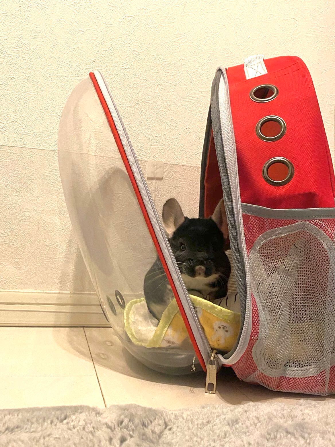 「いつも通りケージから出して部屋でのお散歩(へやんぽ)をしていると、キャリーのリュックに入ってこちらをジーッと見てきました。珍しかったのですぐ写真を撮りました」