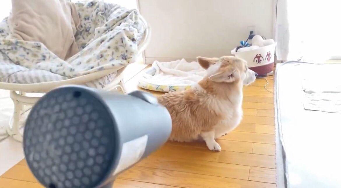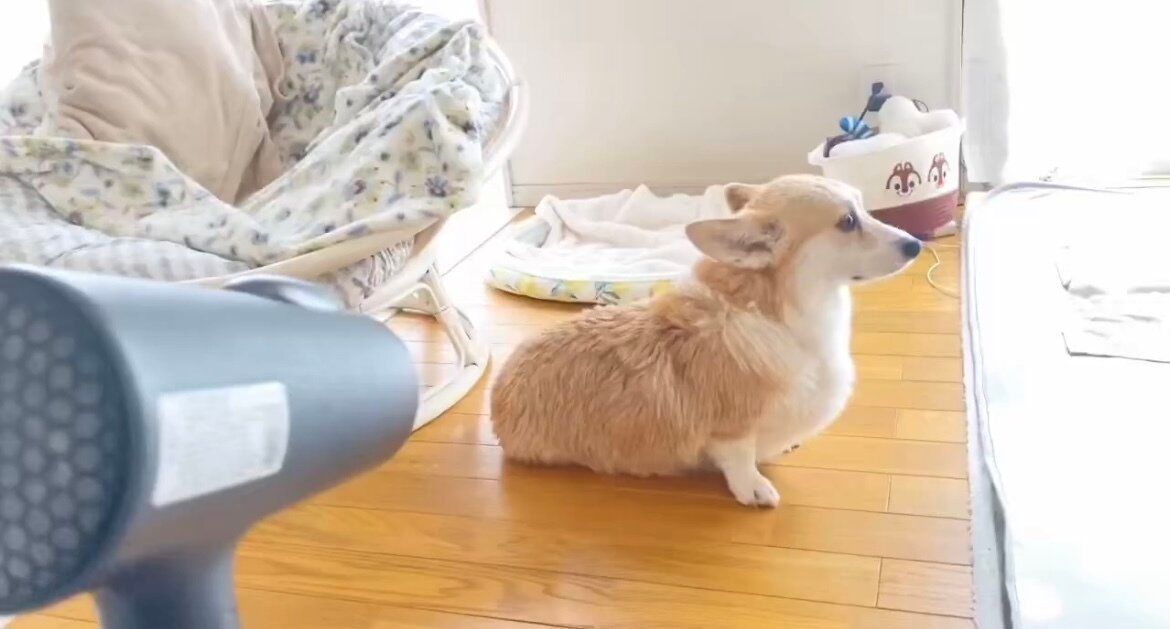 ドライヤーが苦手なコーギー。遠く離れた場所で座り、風を受ける姿がかわいすぎる!「女王様だ」「かわいい」の声