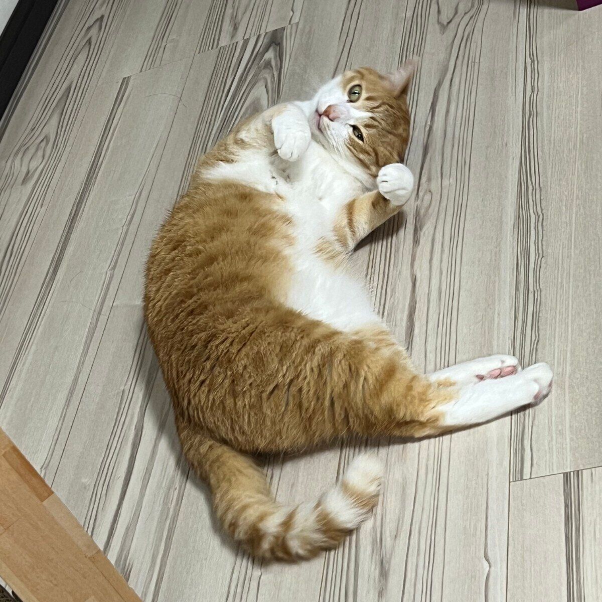 「夕飯をとっていたとき、先にごはんを食べ終えて寝室で休んでいたクウちゃんが、リビングへやってきて転がったときに撮ったものです」