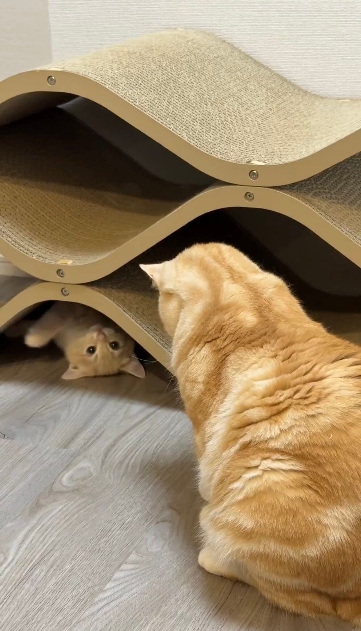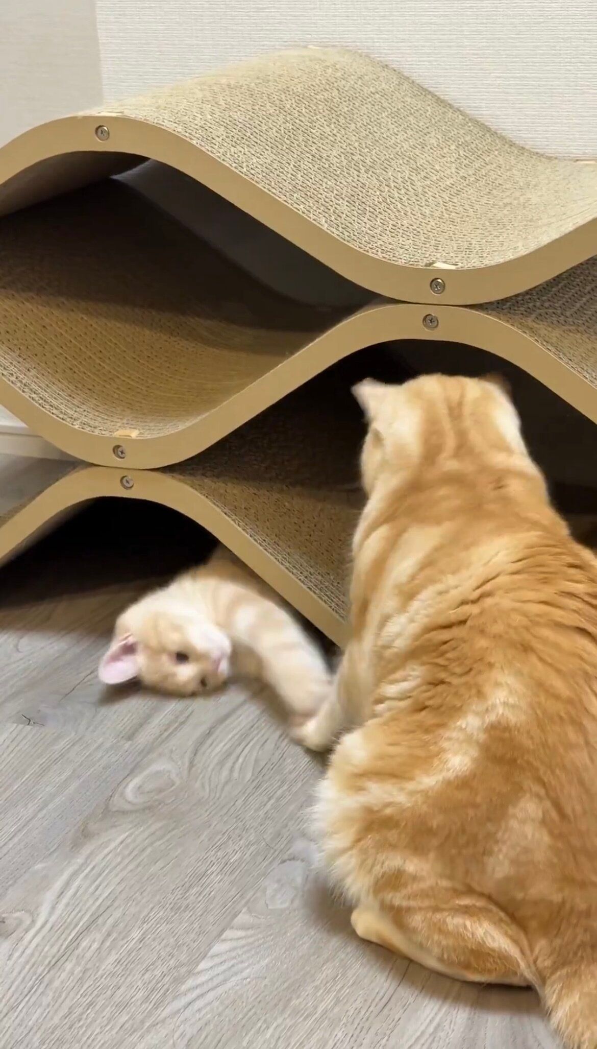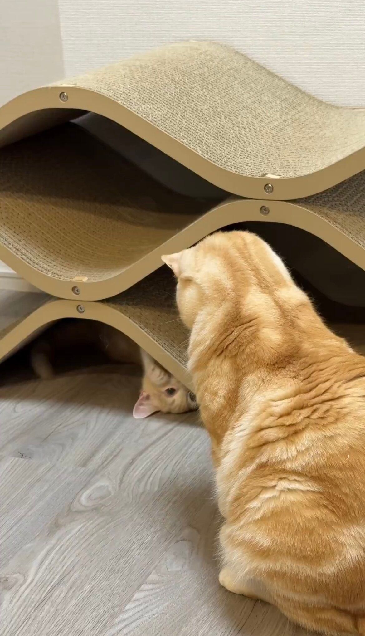「爪研ぎの下に潜ったミクがポッケの前足をちょん、と触っては隠れて……これをずーっと繰り返していました。ポッケは5分くらいで飽きていたようですが、遊びたい盛りのミクのために近くに座ってリアクションして、遊びに付き合ってあげていました。この遊びはミクが寝落ちするまで続いていました」
