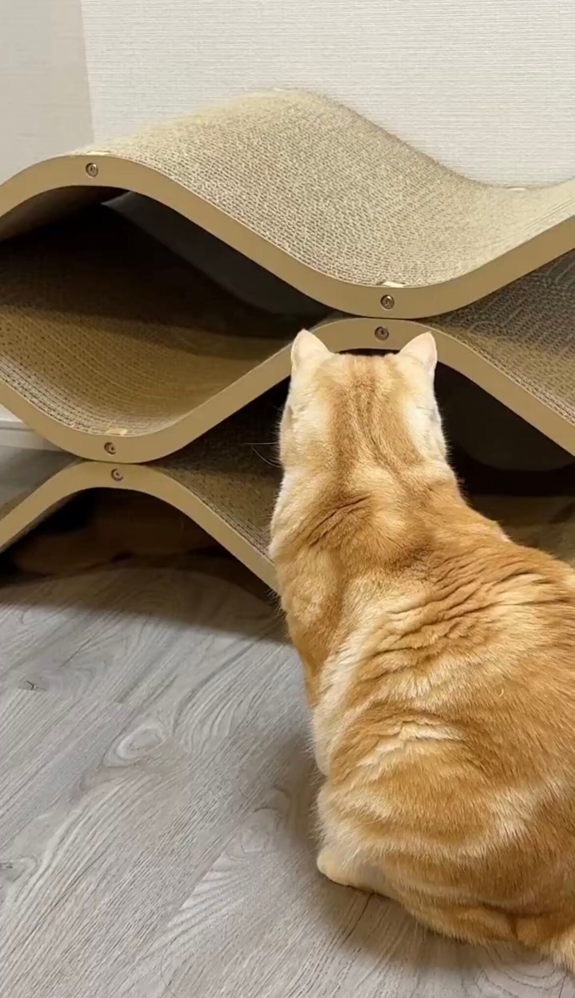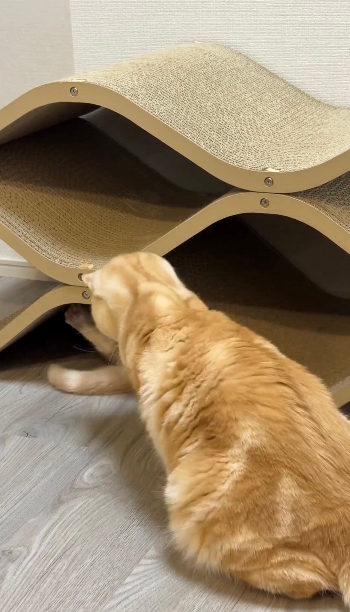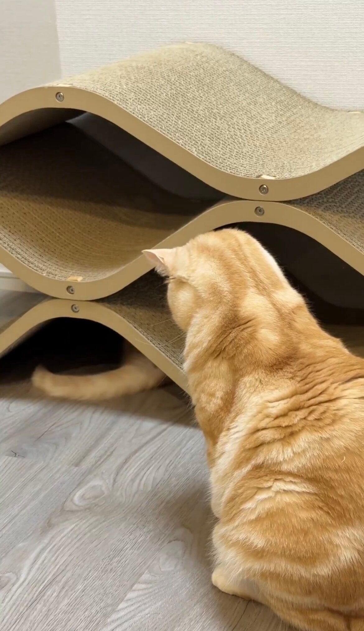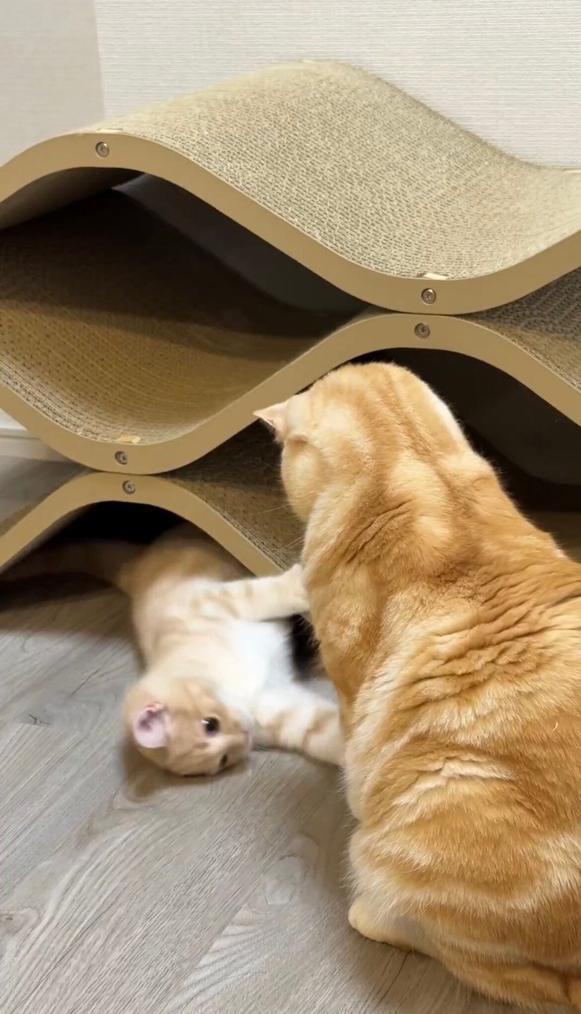 「爪研ぎの下に潜ったミクがポッケの前足をちょん、と触っては隠れて……これをずーっと繰り返していました。ポッケは5分くらいで飽きていたようですが、遊びたい盛りのミクのために近くに座ってリアクションして、遊びに付き合ってあげていました。この遊びはミクが寝落ちするまで続いていました」