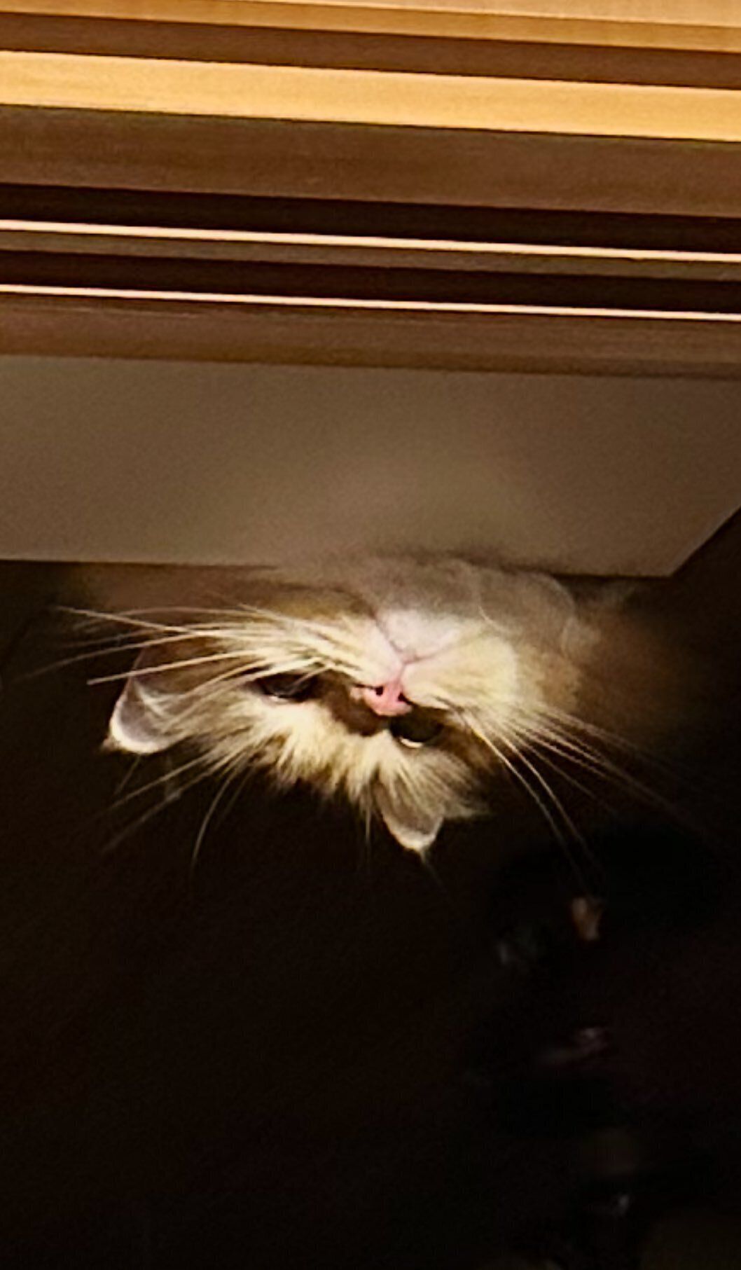 ネコちゃんが天井から生えている!?「ホラーだ」「忍者!?」クセ強な出迎え方に飼い主さんも「変な声出たわ」