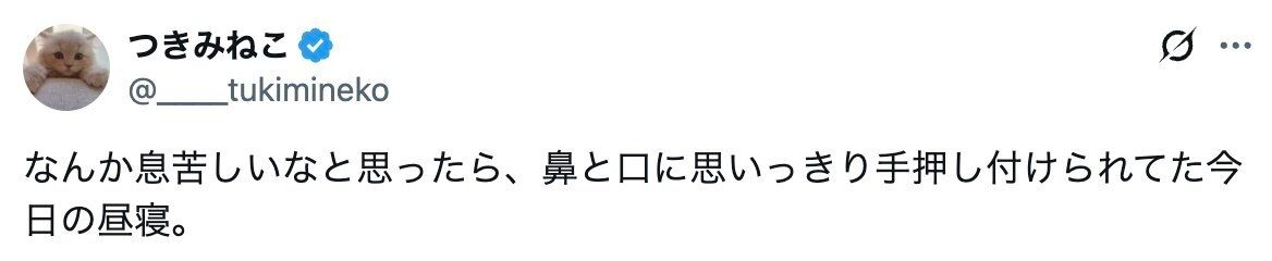 つきみねこさん(@____tukimineko)が投稿したのは、愛猫つきみくんと飼い主さんがお昼寝していたときのこと。つきみくんは、突然飼い主さんの口と鼻をふさいだのです!飼い主さんも悶絶した、そのかわいすぎる理由に注目してご覧ください。