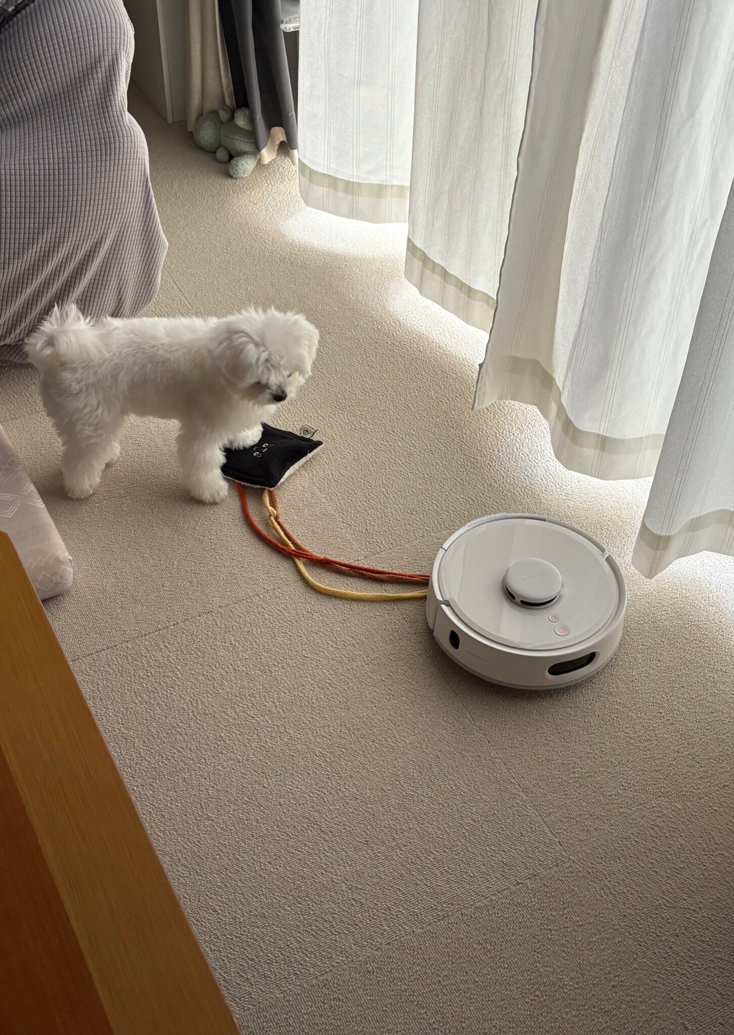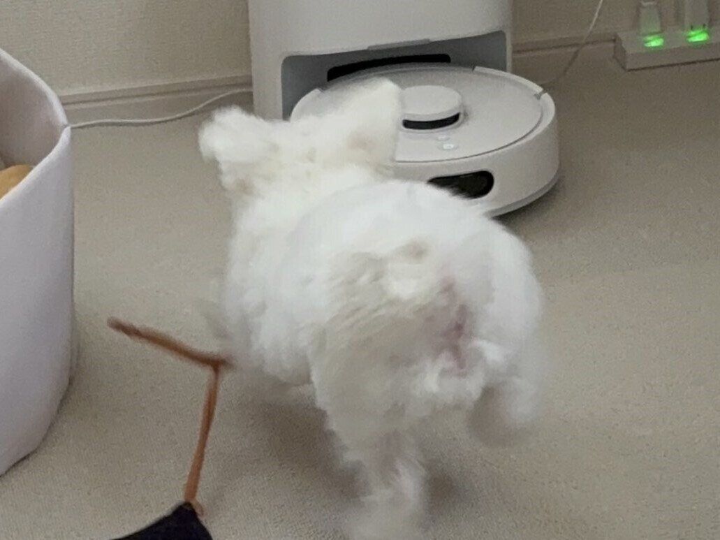 しかしライスくんはというと、紐のおもちゃを用いてロボット掃除機とたわむれるのは、その後も相変わらずの様子です。