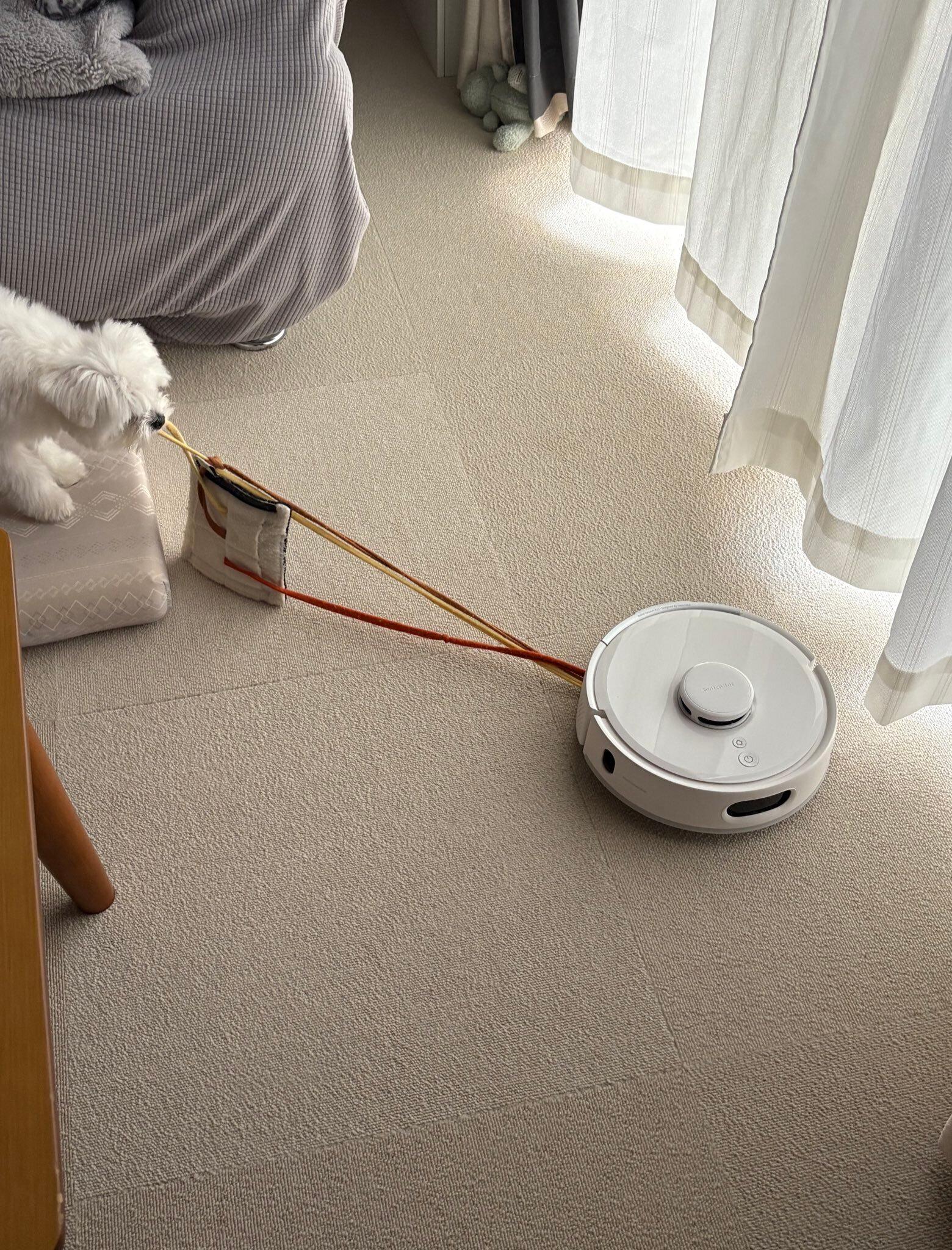 「掃除機のゴミを集める部分のブラシにおもちゃの紐を絡ませるのを覚えてしまい、掃除機が異物を吸い込んだと認識し停止してしまいます(笑)」