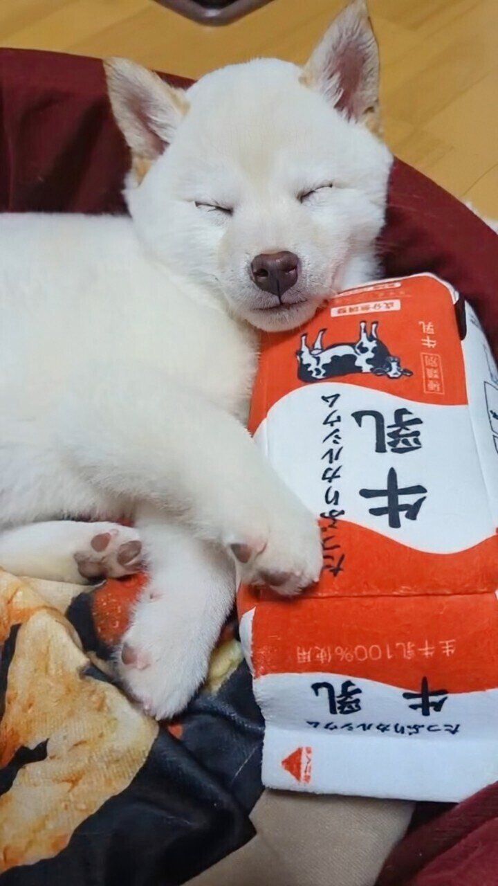まんまるくんが抱きしめているのは、牛乳パックをモチーフにしたぬいぐるみで、飼い主さんに生まれて初めて買ってもらったおもちゃなのだそう。