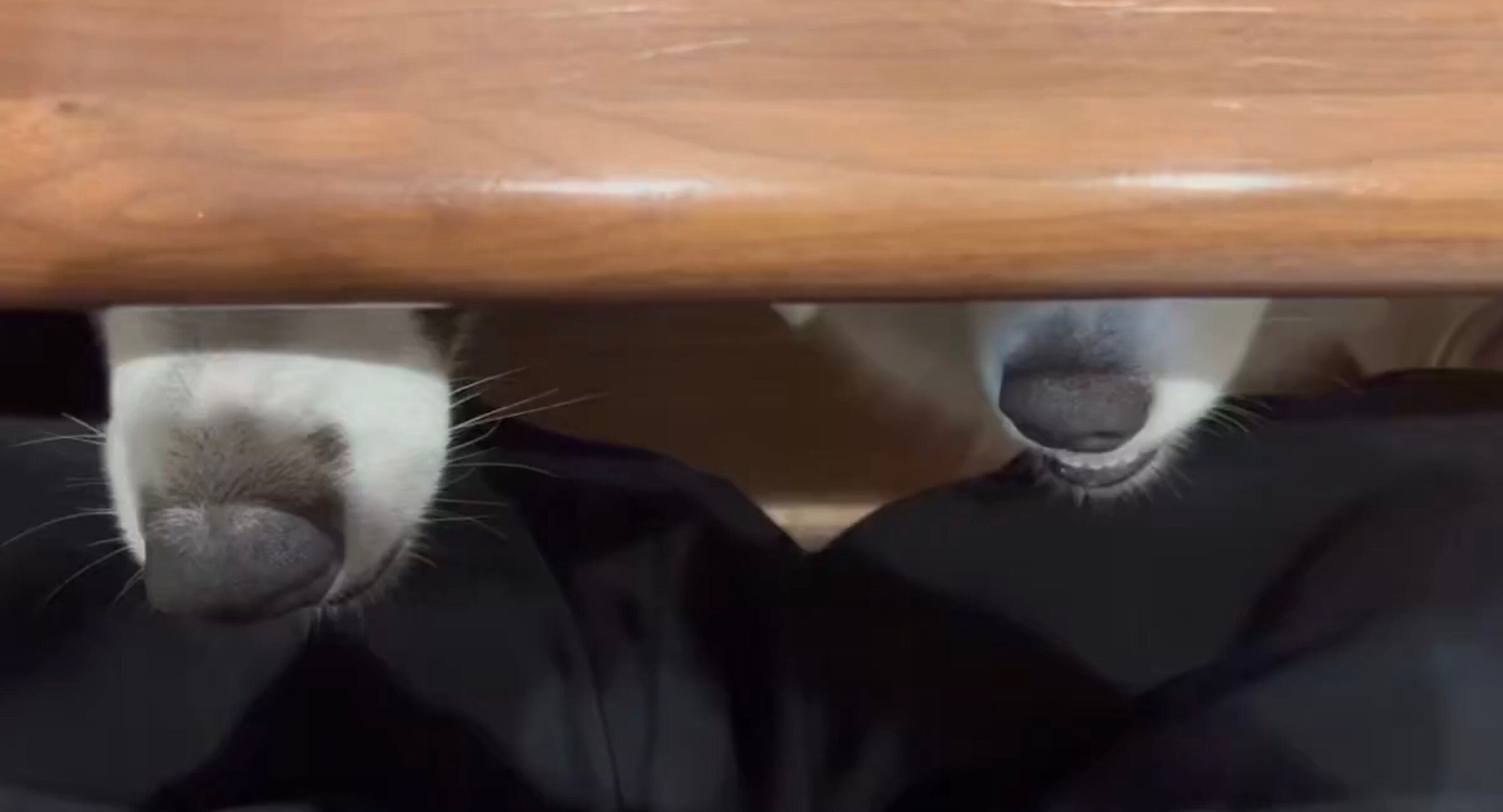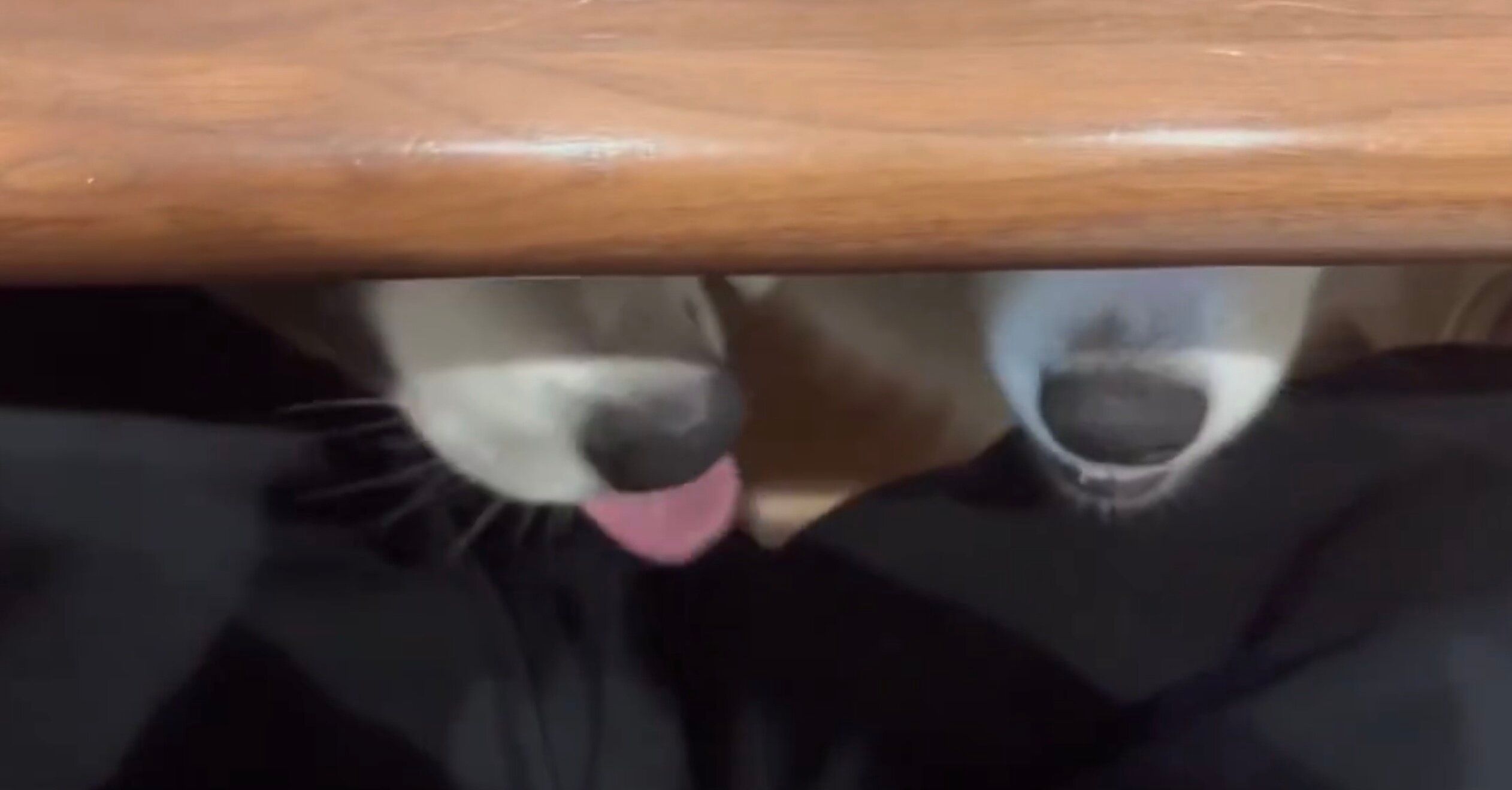 動画には、テーブルの下から飼い主さんをのぞき込む、ノエルちゃんとフラウちゃんの姿が!