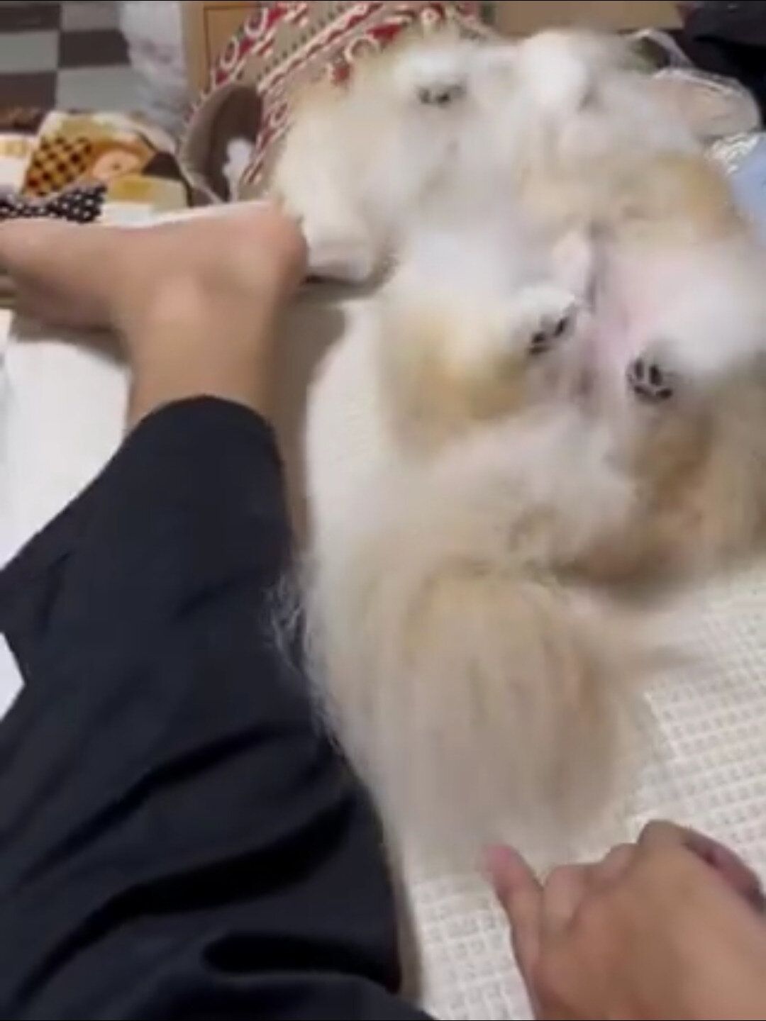 ついには手を使い始める飼い主さん。レオくんの足をどかしますが、レオくんもまた、やられっぱなしではいませんでした。両足をピーンと伸ばし、飼い主さんに見事なキックを決めます。
