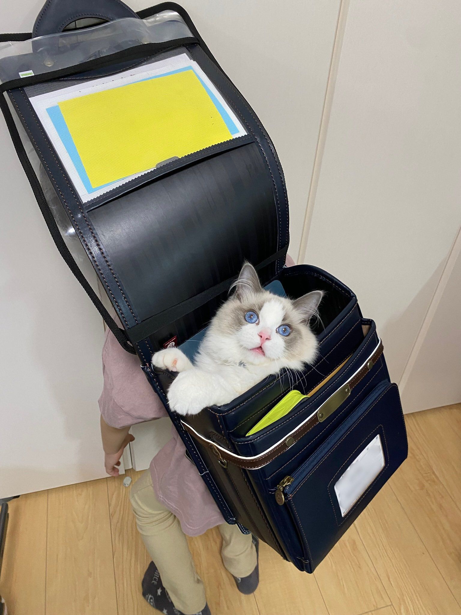 ランドセルに入ることで、身体の大きさがどれくらい成長したかが分かります。「ランドセルで成長記録」というコメントとともに、LUCAラグドールさんが投稿した写真がこちら。