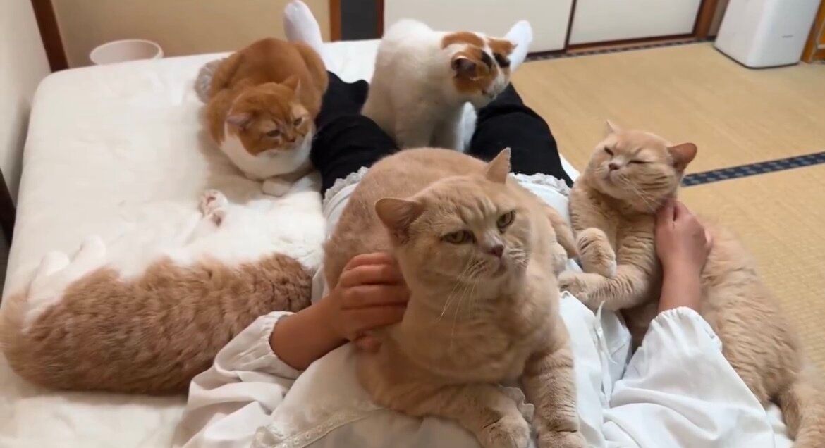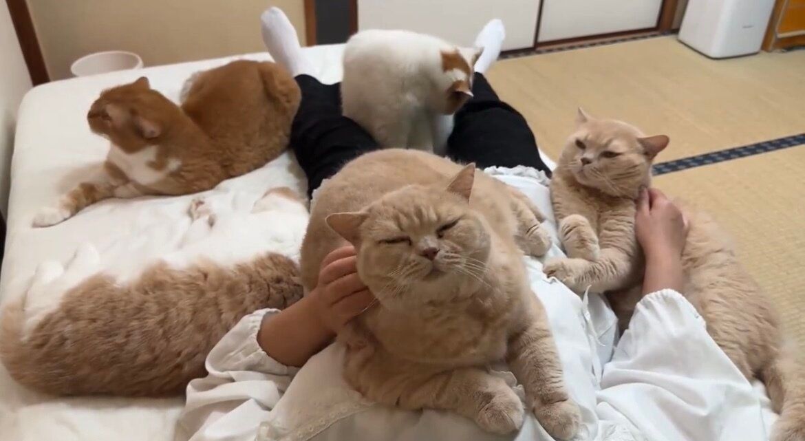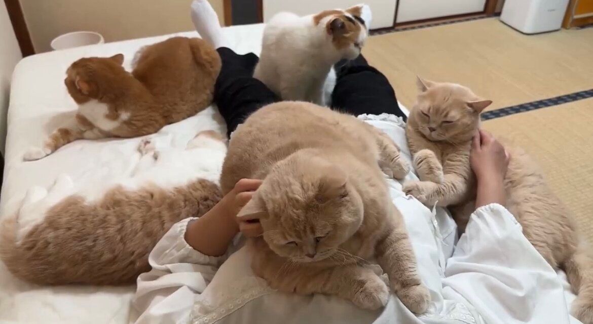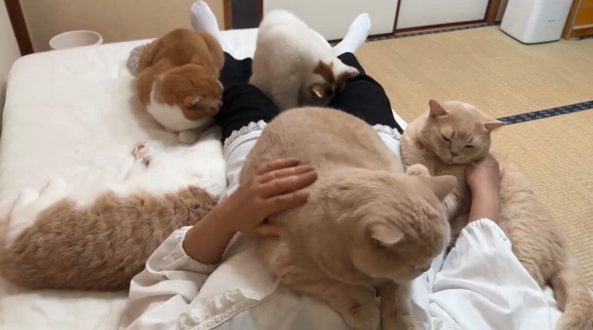 お腹の上に乗ったり、身体にぴたっとくっつき甘える様子の猫ちゃんたち。