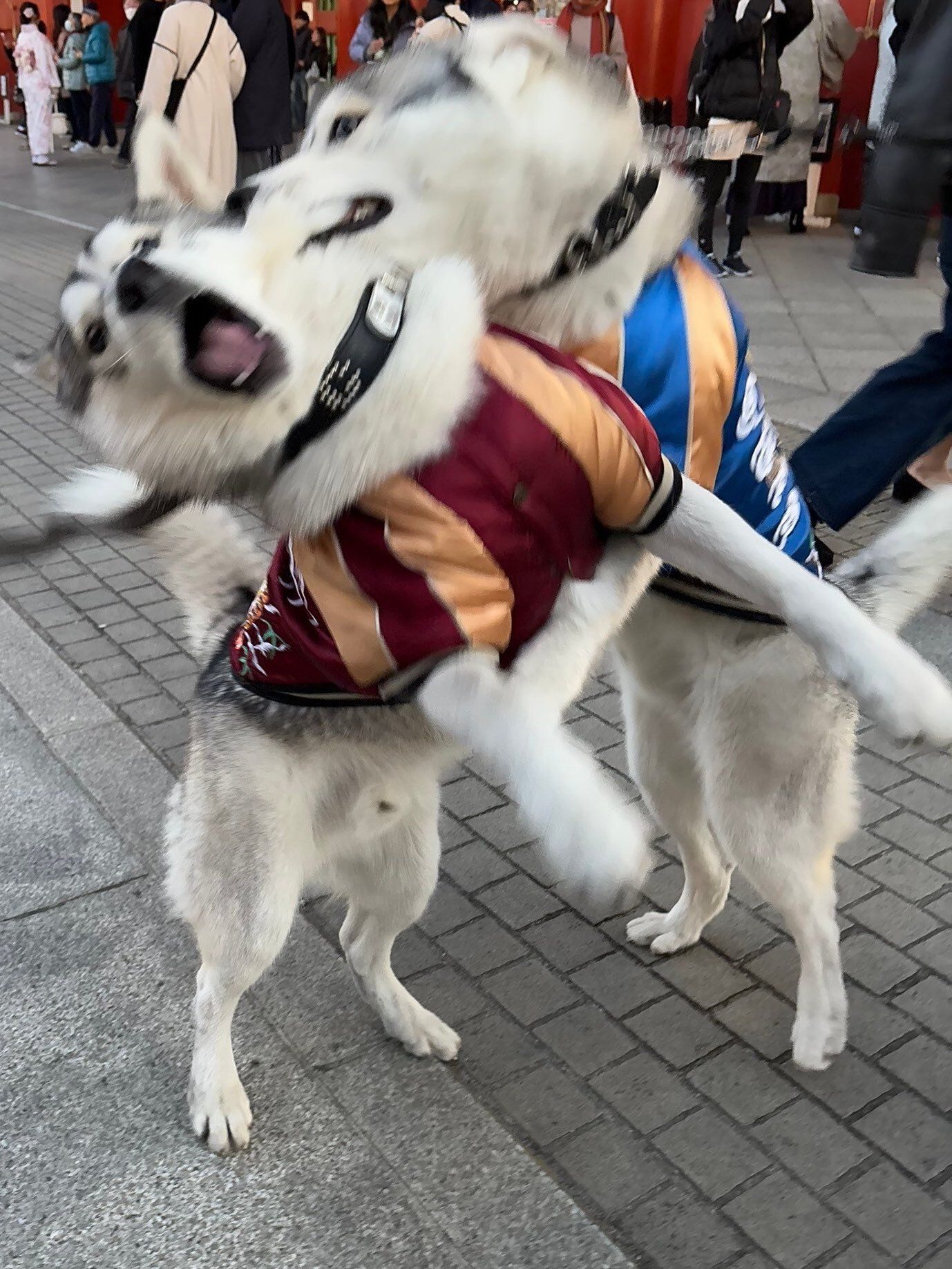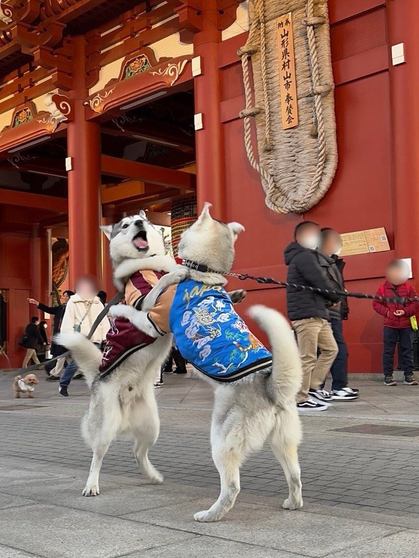 浅草雷門の前で突然始まったハスキー犬のワンプロ。スカジャンを着た二匹の激しいじゃれ合いに4.1万件のいいね