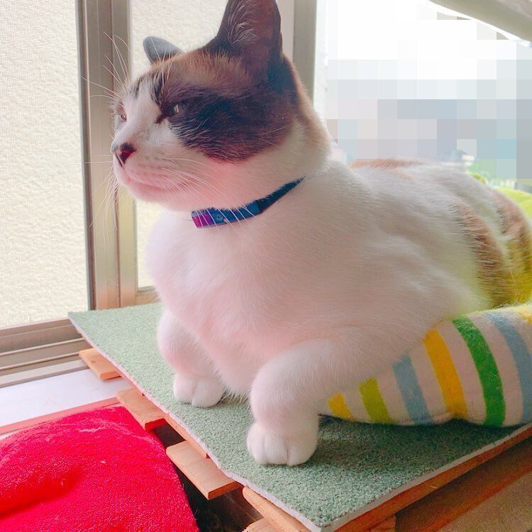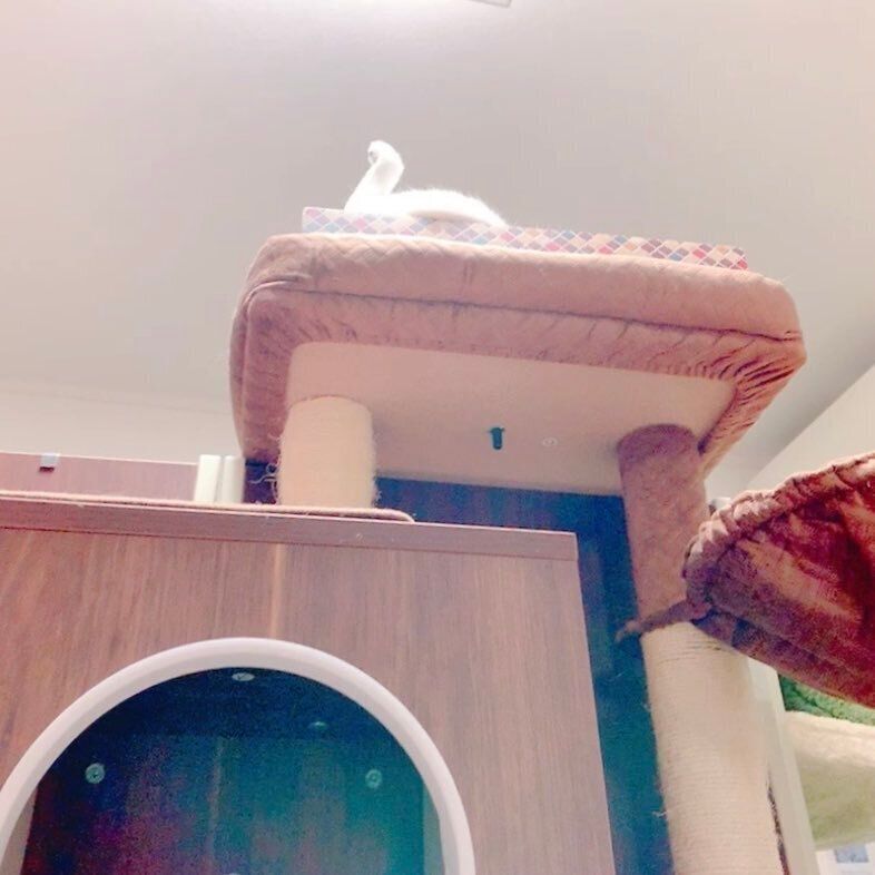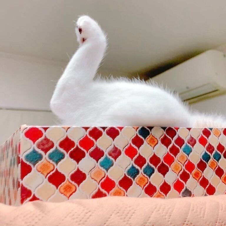 「キャットタワーの上にある、段ボール型爪とぎベッドでぽんちゃんが寝ていたのですが、ふと見たら写真のような状態になっており、照明の効果もあって『白鳥……?』と思いました。よく面白いポーズで寝る子なので、今回も笑いながら撮影しました」
