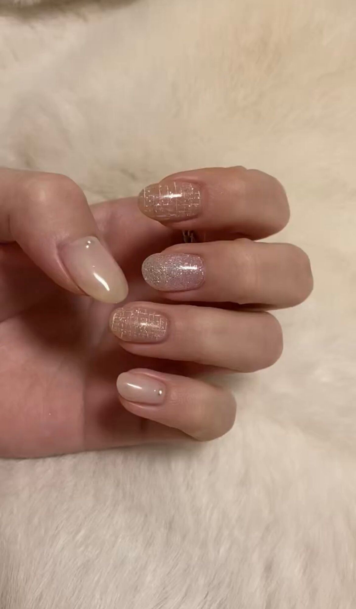 白くてふわふわなファーを背景に可愛らしい素敵なネイルが写っています。