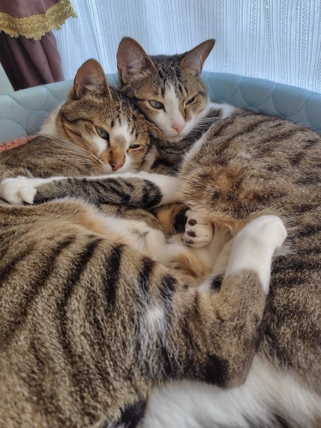 朝ごはんのあとはいつも横になって休んでいるというソーダくん・レモンちゃんですが、この日はくっつくだけではなく、手足を体の上に乗せ合っています。