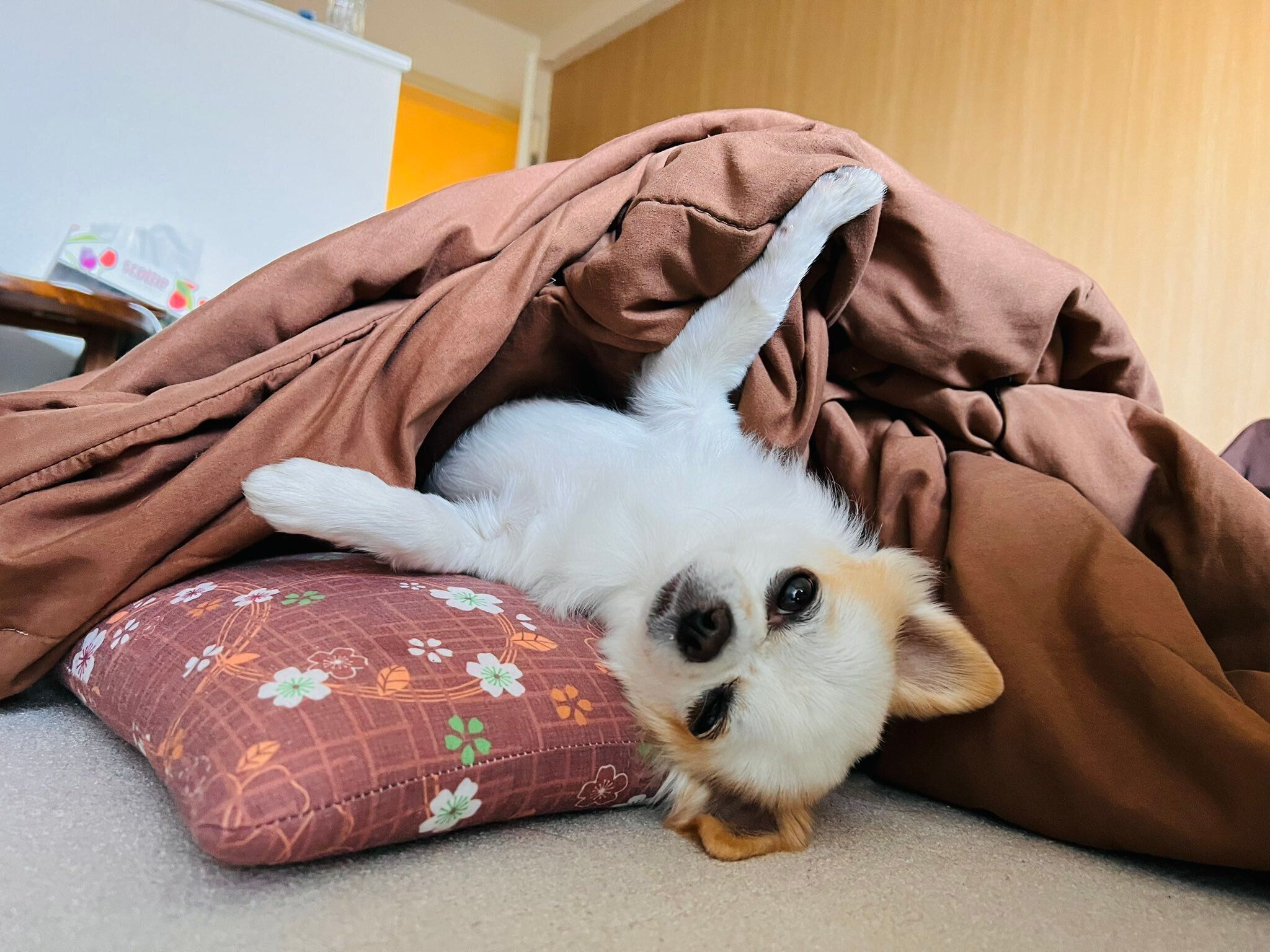 布団から出たくないチワワに「気持ちわかるわ」の声。布団と枕を巧みに使いこなし”散歩拒否”の意思表示