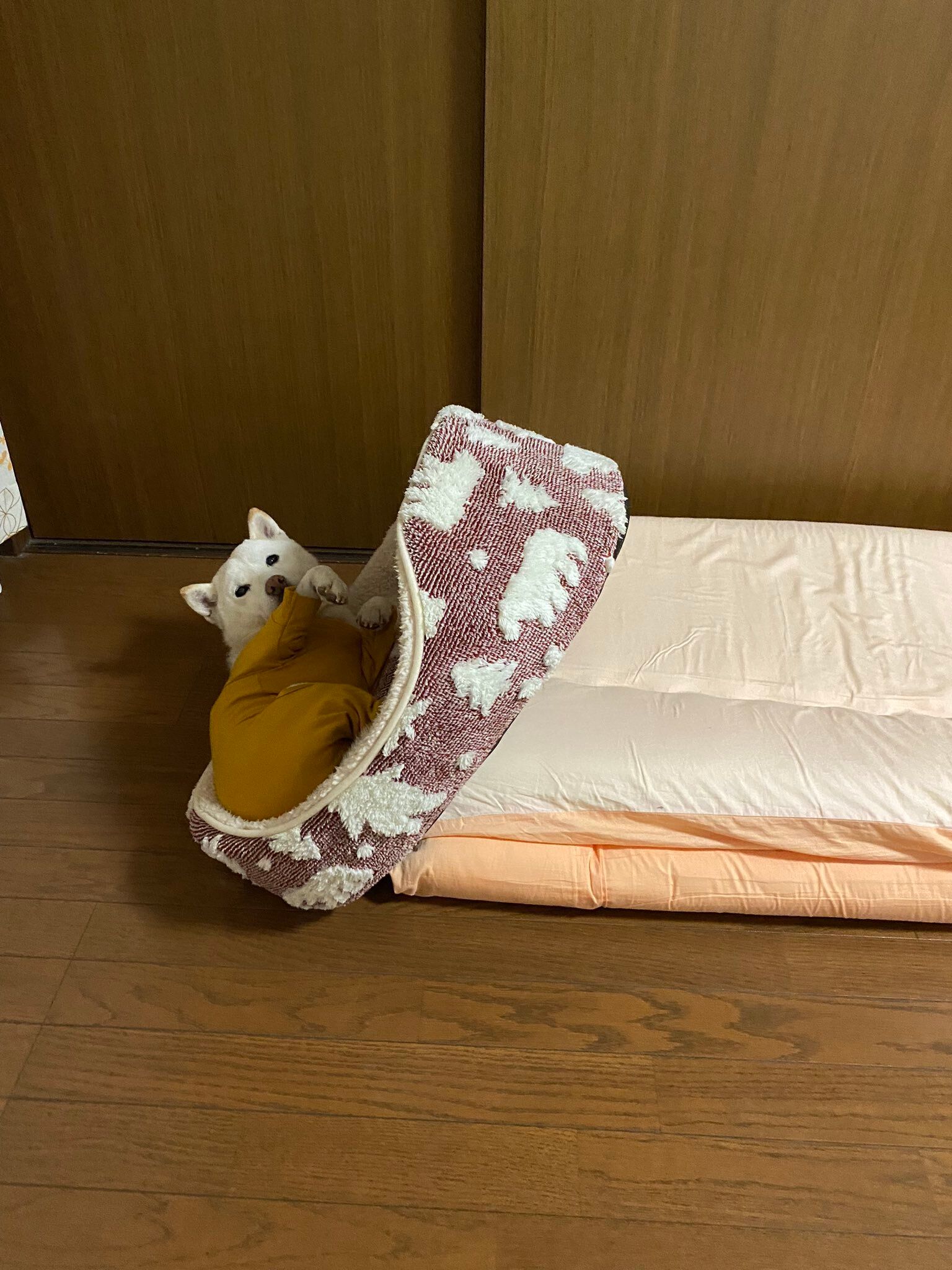 ベッドごと布団の上から落ちてしまい人間さながらの表情を浮かべていたまつちゃん。その後さらに転がり逆さまになってしまった姿には、多くの人が驚くとともに大きな癒やしをもらいました。