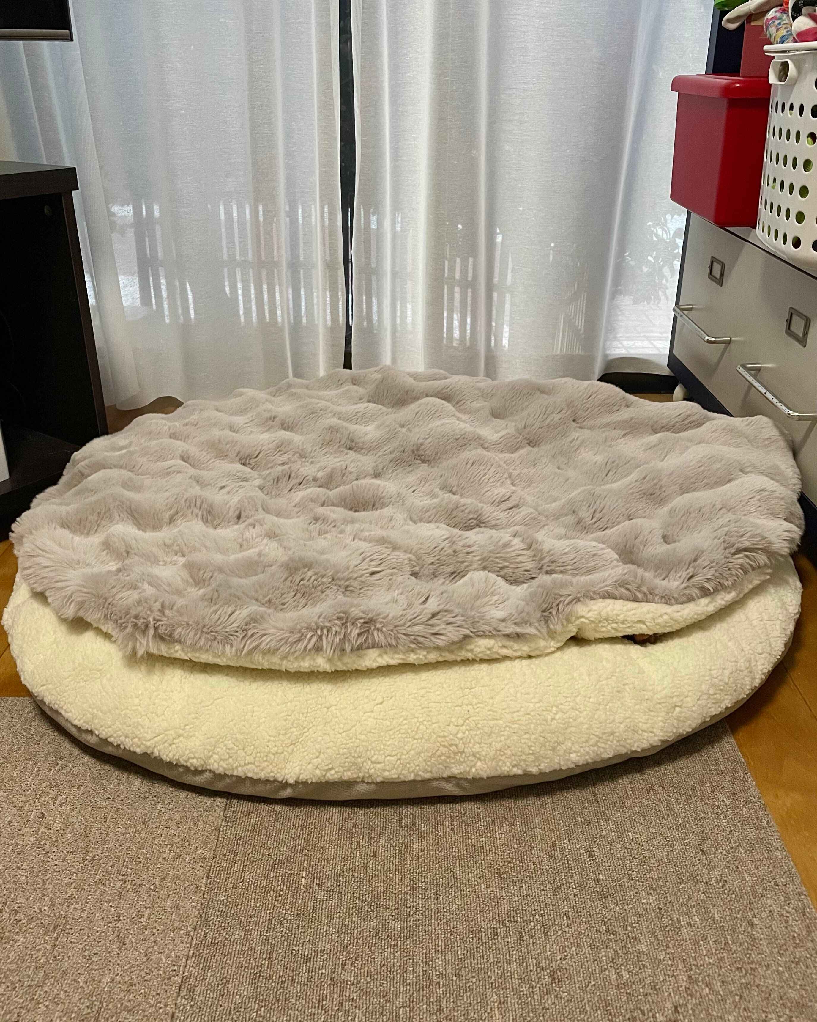 「あまりに平らでおもしろかったのですが、ここまで平らになってしまうと本当に中にいるのかわからないので、中にいないと思ってうっかり毛布を移動させたり踏んだりしないよう気をつけようと思いました」