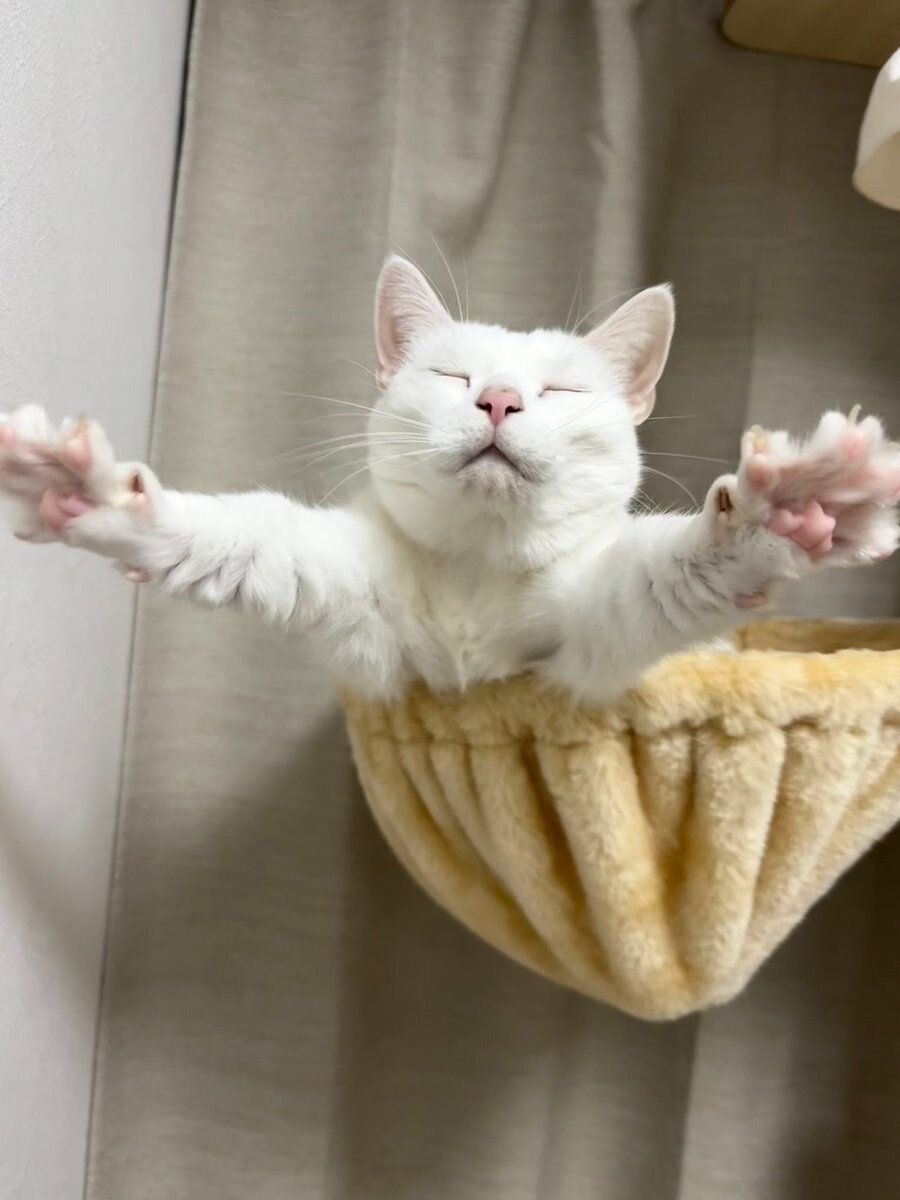 うに/ハンモックアートさん(@Utans_Uni_Unagi)の投稿をご紹介します。投稿されたのは、愛猫が両手をピンと伸ばして気持ちよさそうに伸びをする写真。まるでタイタニックごっこをしているかのようなその姿に「かわいい」の声が集まりました。
