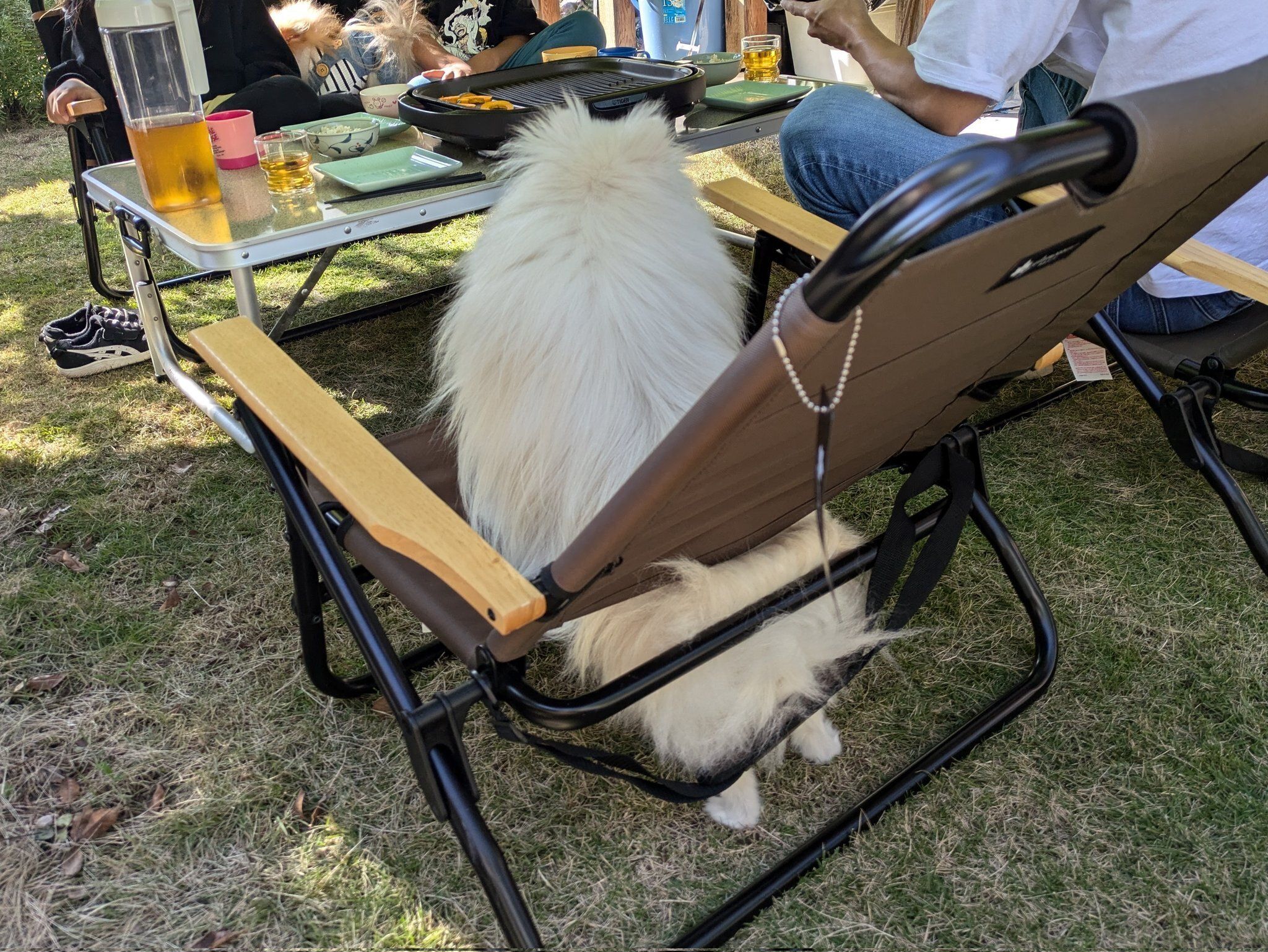 「お庭でBBQをしていたときのことです。私が自分の席に座ろうとしたら、ぱぴちが座っていると思ったのに立っていて、その姿がおもしろくて写真を撮りました」