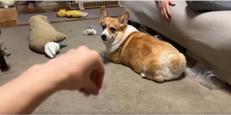 クルッと首を振り向いた状態で、飼い主さんの手の動きを見つめるはなちゃん。そして、その場で立ち上がると、飼い主さんの手に吸い寄せられるように走ってくるのでした。