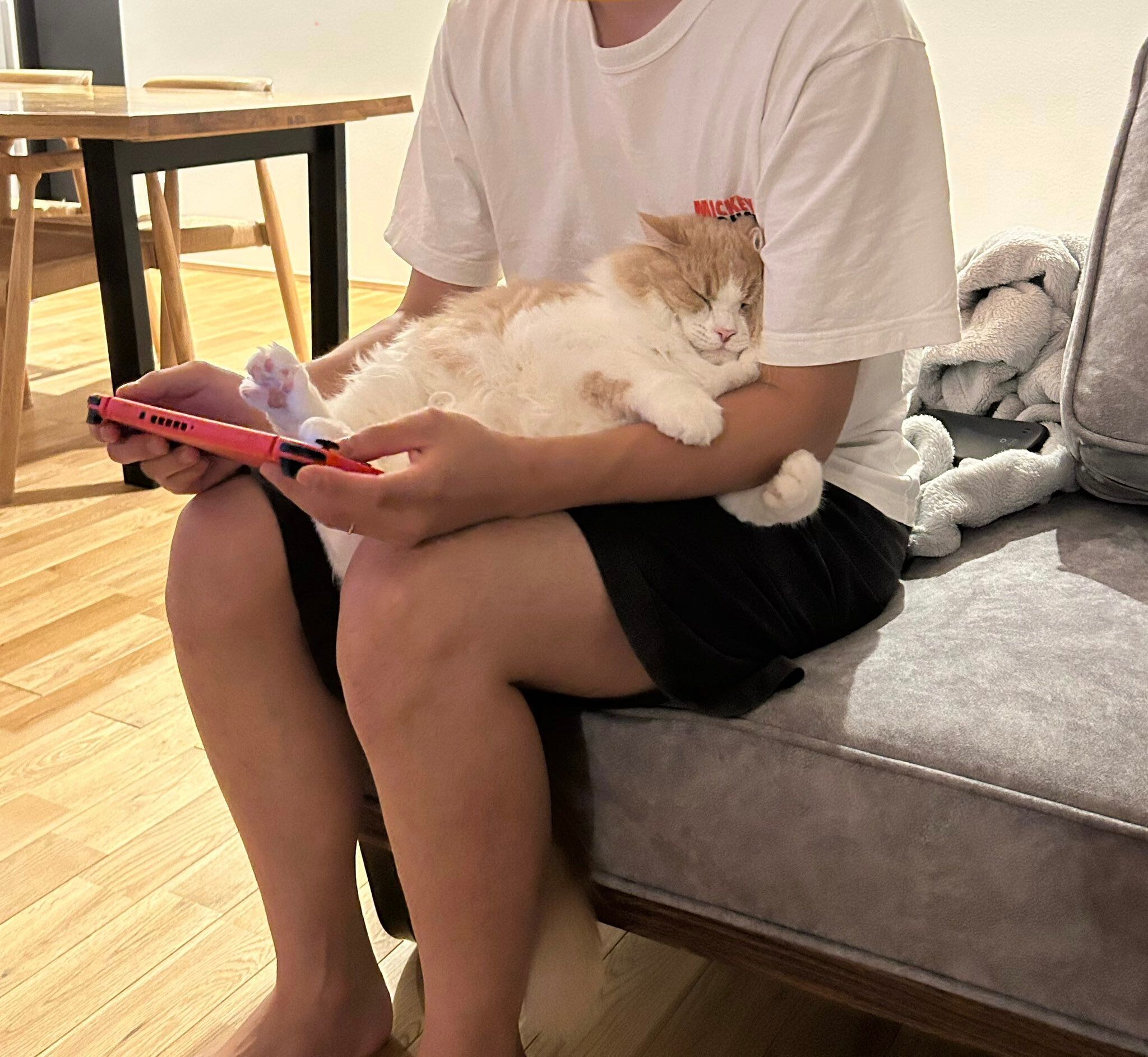 グラくんといっしょに写っているのは、飼い主さんであるパパ。ソファに座りゲームをしているようです。