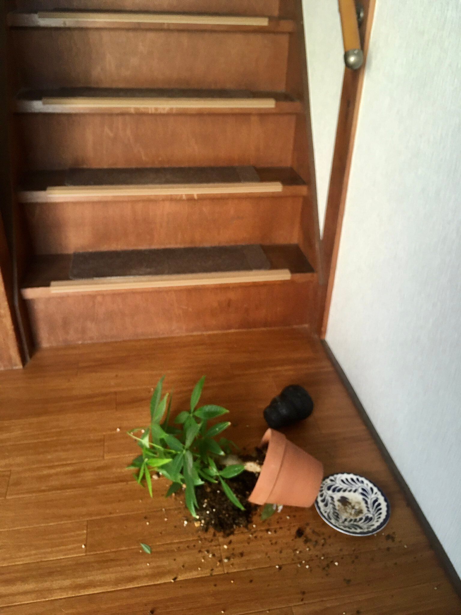 riyaさんは、「階段上からオモチャぶん投げて遊んで鉢に当てた奴は誰かな……」というコメントとともに悲劇の現場を写真で紹介しました。