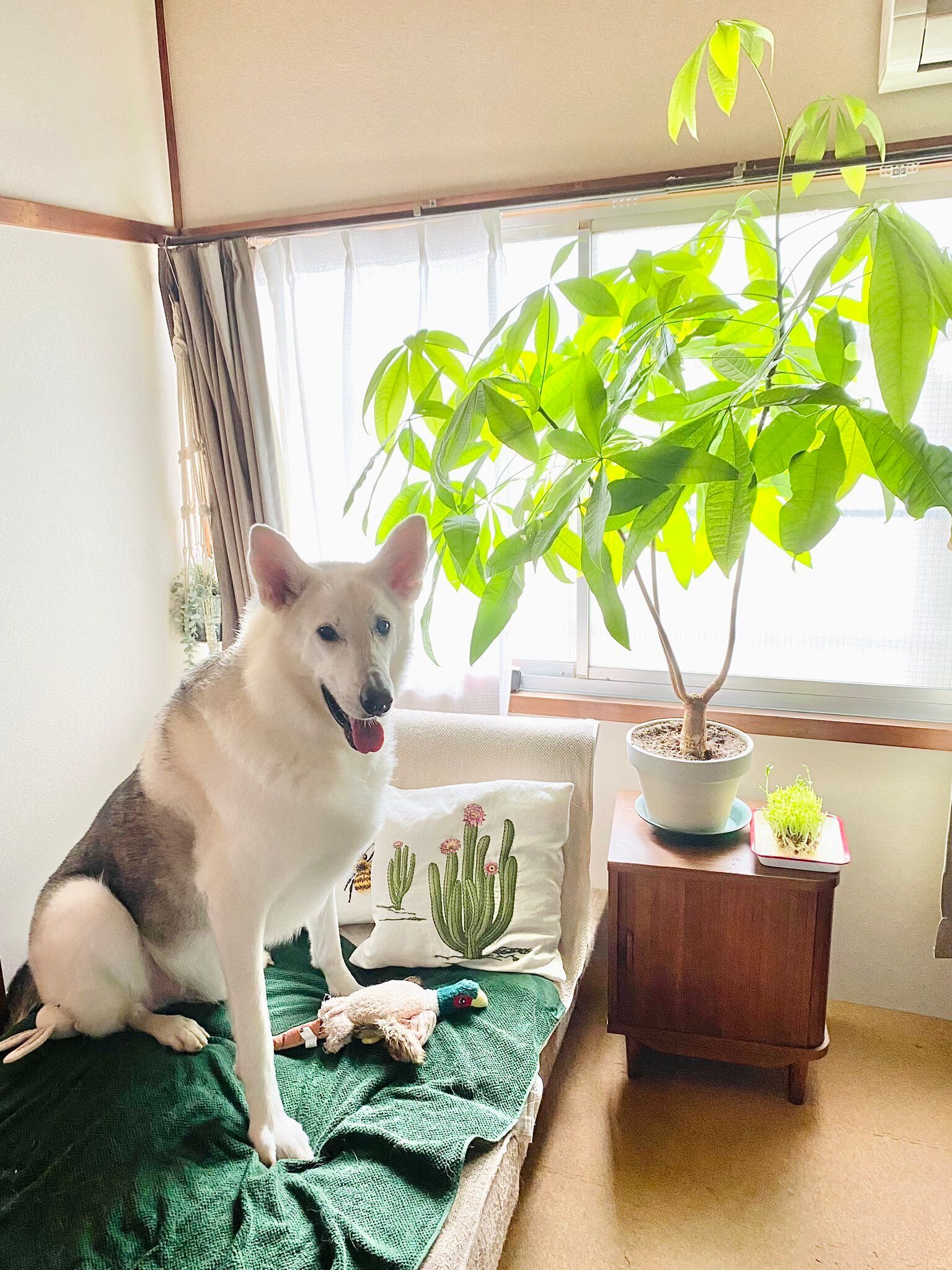 立派になったパキラの横で、サンくんもうれしそう。まるで「私が育てました」とでも言っているようですね。