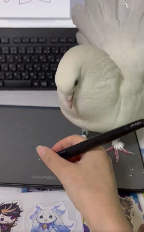 「絵は絶対に描かせないマン!」というコメントが添えられた今回の投稿。そこには、タッチペンを手に持つ飼い主さんの手と、その前に立つクジャクバト・むぎくんの姿がありました。