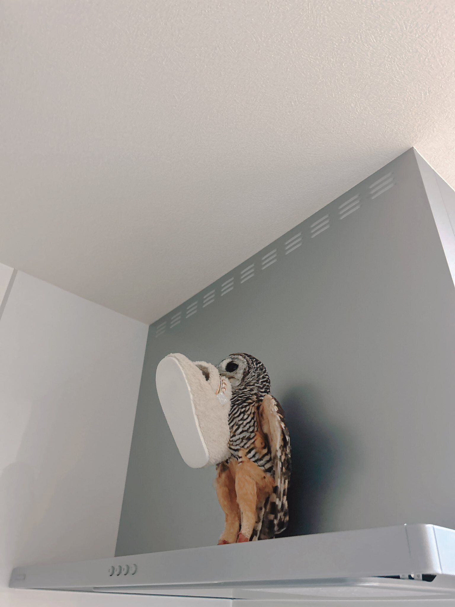 「スリッパがわりと好きなので、私がスリッパを脱ぐと、くちばしでくわえて持っていってしまうことがたびたびありました。この日もスリッパを脱いで床に置いていたら、くわえてキッチンのレンジフードの上に持って行ってしまいました」