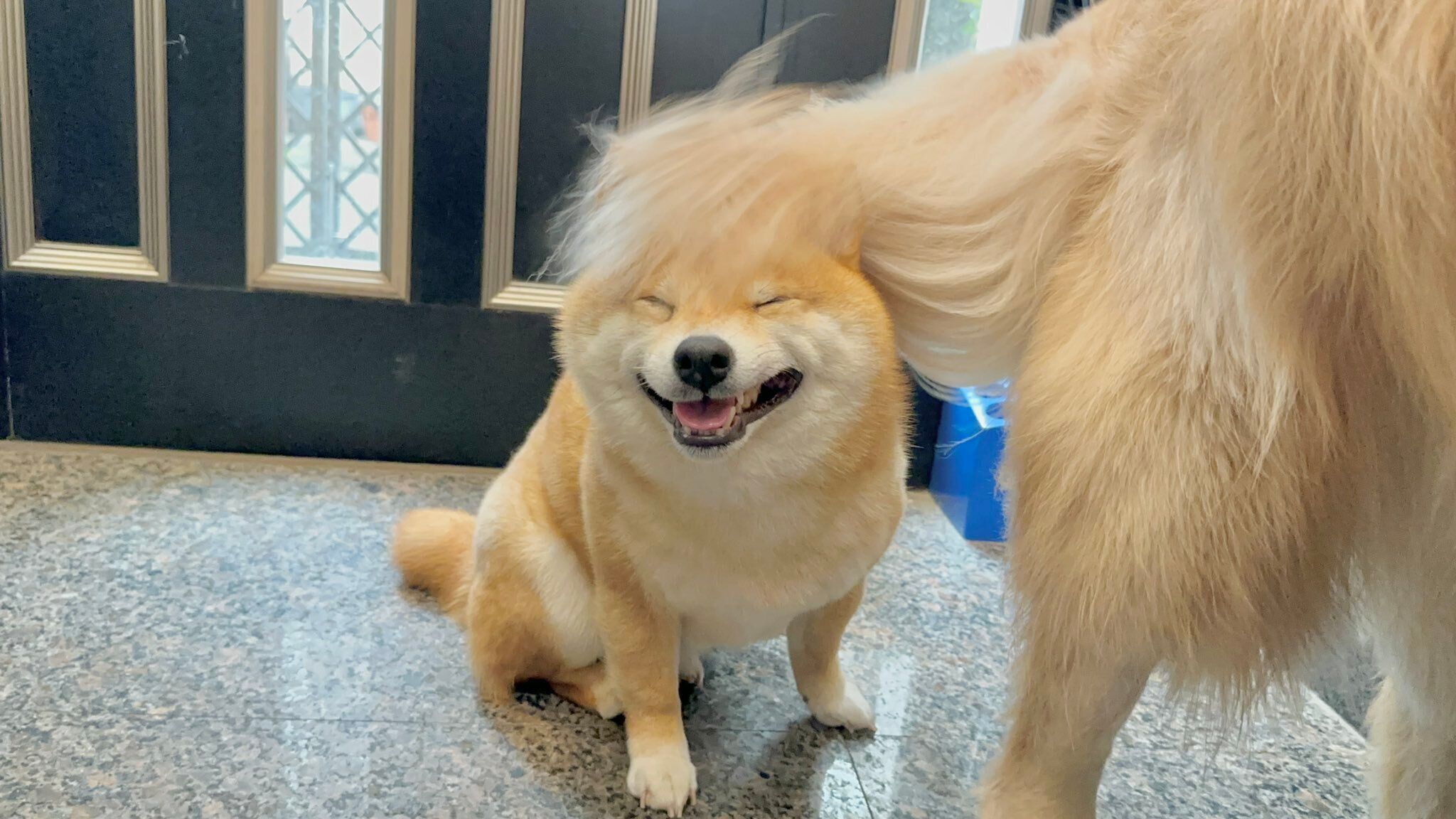投稿された画像に写っていたのは、一見カツラをかぶっているようにも見えるうにくんです。目を細め、その表情はニコニコと笑っているように見えますが、なんと頭の上に乗っていたのはカツラではなくおからちゃんのしっぽ。