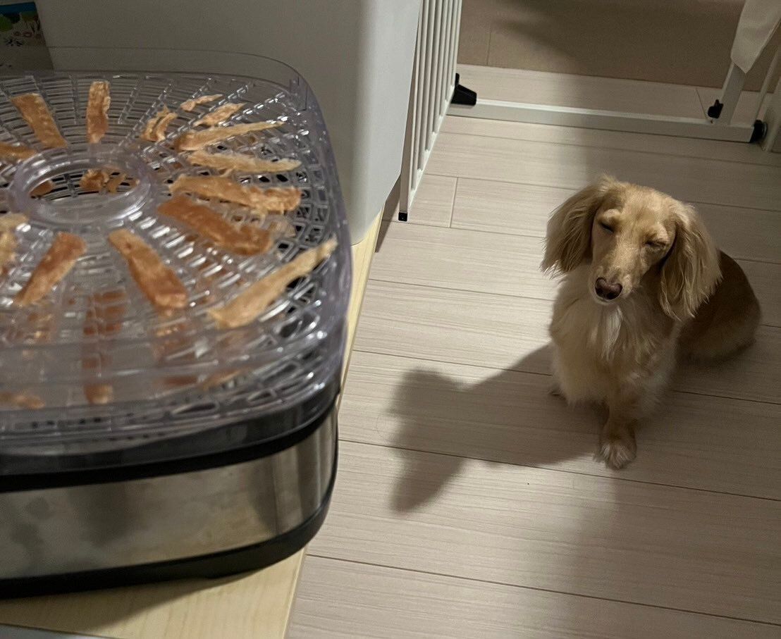 「夜中の3時にジャーキーができあがって回収しようとしていたところ、ベッドで寝ていたちゃちゃがこちらにやって来てジャーキーの前に座りました」