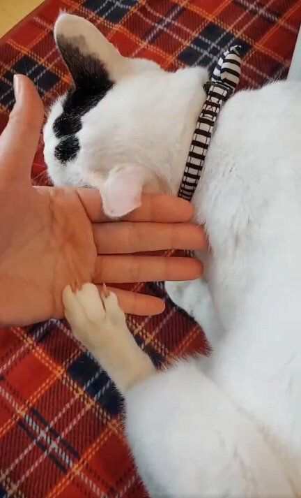 小刻みに動く豆大福くんの後ろ足が“カイカイ”しているのは、なんと飼い主さんの手のひらなのでした。