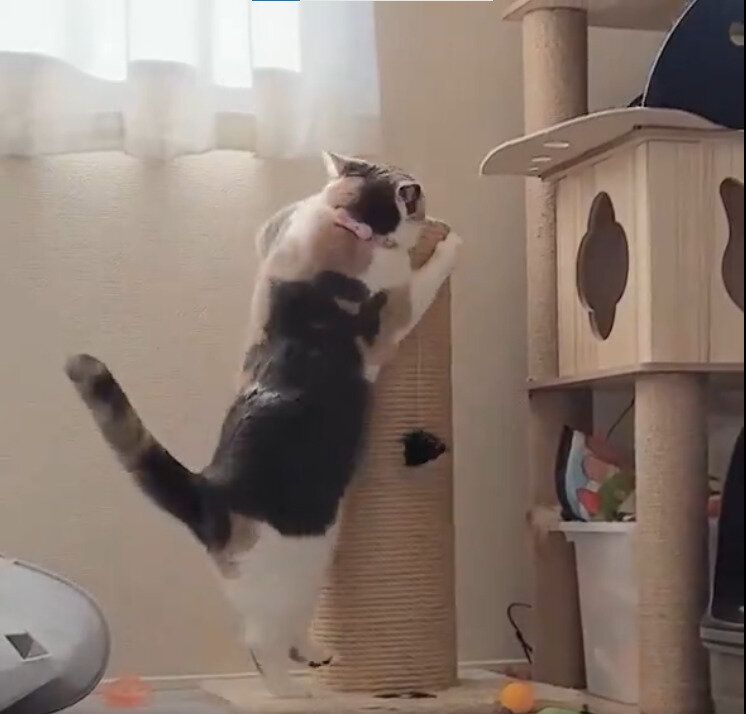 今回の投稿には子猫時代のみゅーちゃんがひっかきポストに登る姿も続けて紹介されていました。みゅーちゃんは0歳で飼い主さんのおうちにやって来たころから、すでに同じ登り方をしていたのだそう。
