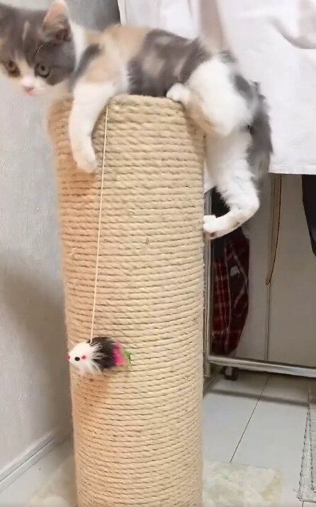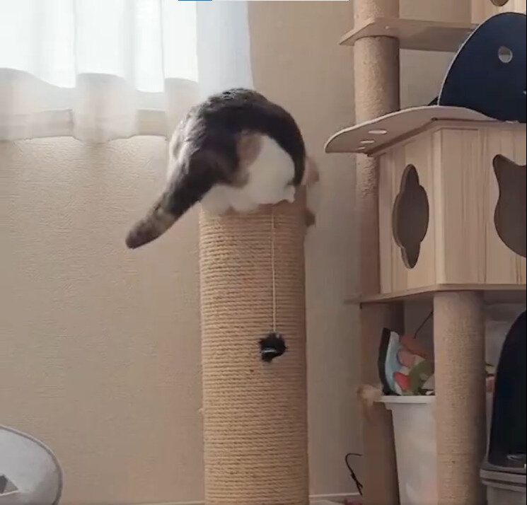ひっかきポストの上に登りたかったみゅーちゃん。体を伸ばしてポストの上部に何度も両手をかけ直し、登りやすい位置を一生懸命探します。良い位置が見つかったら、一旦ポストの中腹めがけて後ろ足でジャンプ。