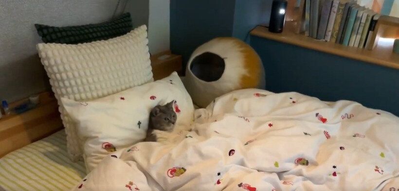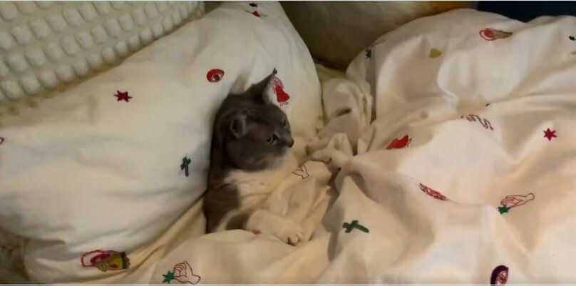 ベッドで動画を見ていたら、だんだん眠くなってきたメグちゃん。人と同様に、猫も布団でダラダラすると、心地よくなるのかもしれませんね。