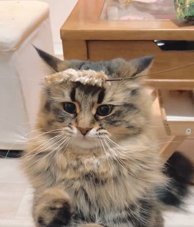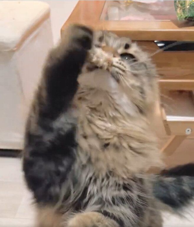 素早く前足を動かして、目の前で動く猫じゃらしを掴もうとするヤマネコくん。そんなとき、飼い主さんが振る猫じゃらしがヤマネコくんの頭の上に乗ってしまいます。