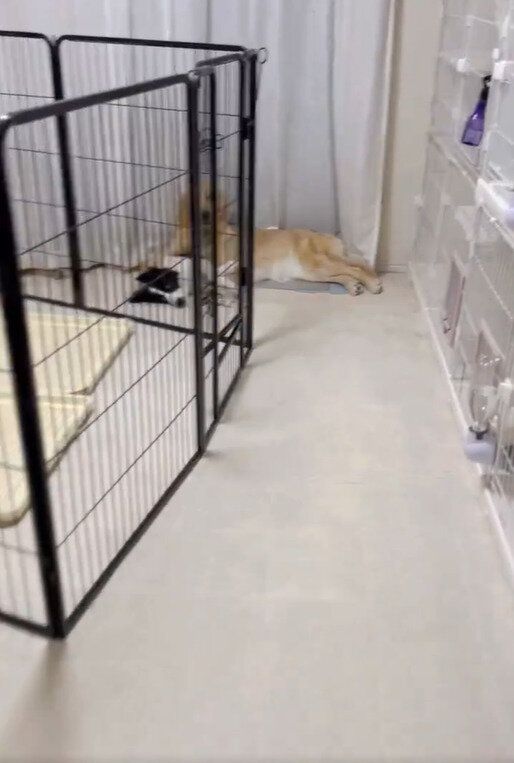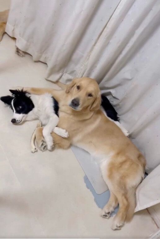 「いつも仲よしなふたりの様子を見に行くと……」というコメントから始まる今回の投稿。飼い主さんがカメラを持って入って行った部屋の奥には、ボーダー・コリーのレベッカちゃんとゴールデン・レトリバーのつゆちゃんの姿がありました。
