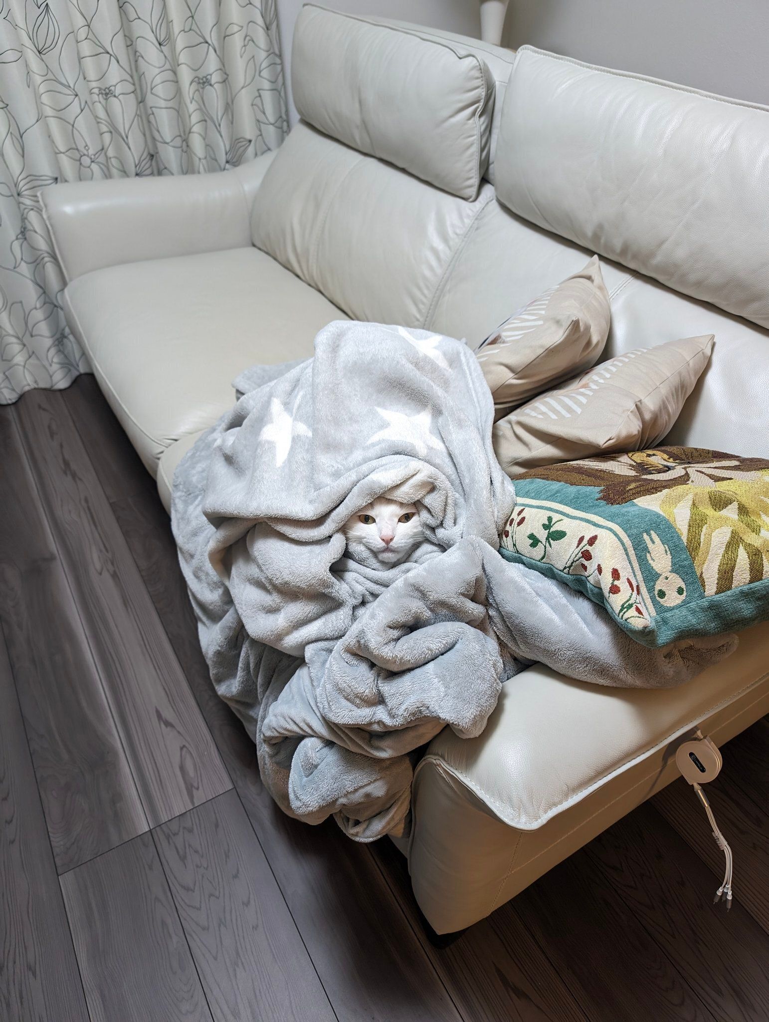 ちなみに毛布にくるまったハク様を見て、飼い主さんは「綺麗に二度見しました(笑)」とのこと。