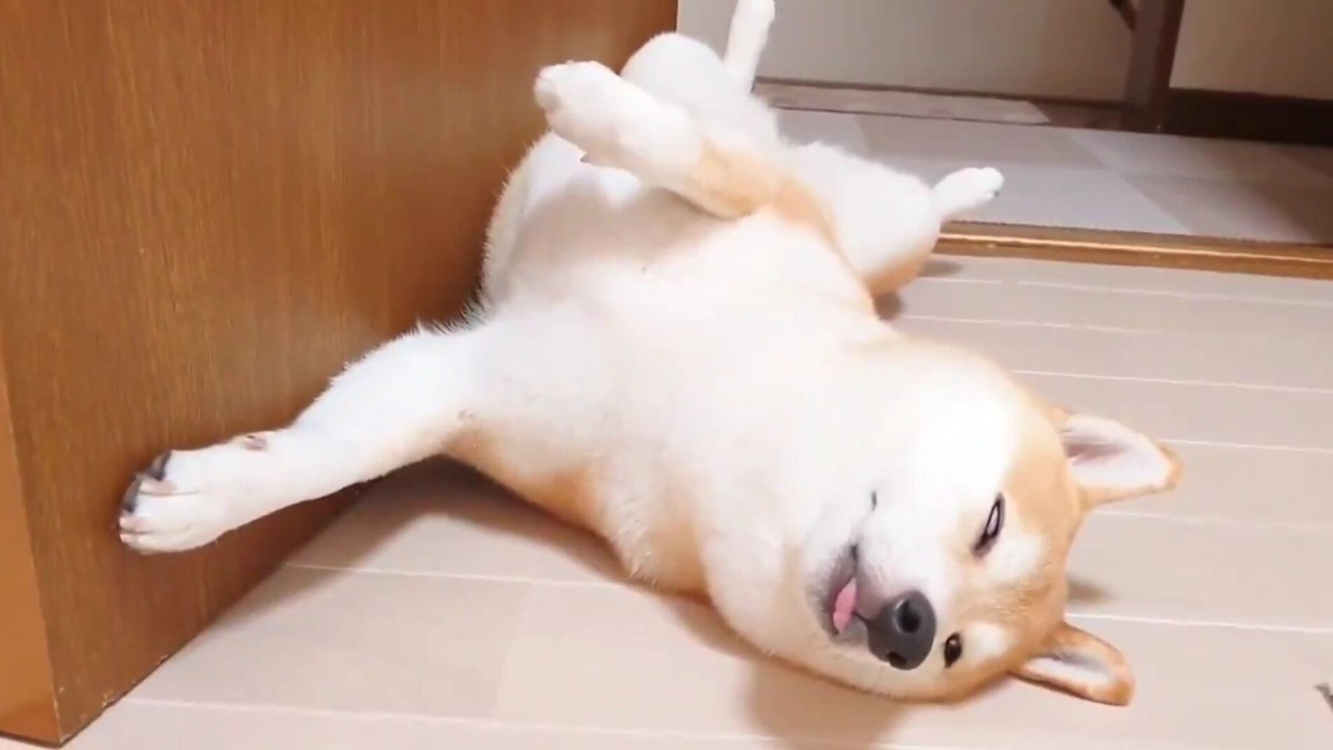投稿動画の左側に映るドアを左手と脇腹で押さえながら仰向けになり、ほかの手足は脱力しきって宙に浮いています。絶妙なポーズが見る人の笑いを誘いますね。