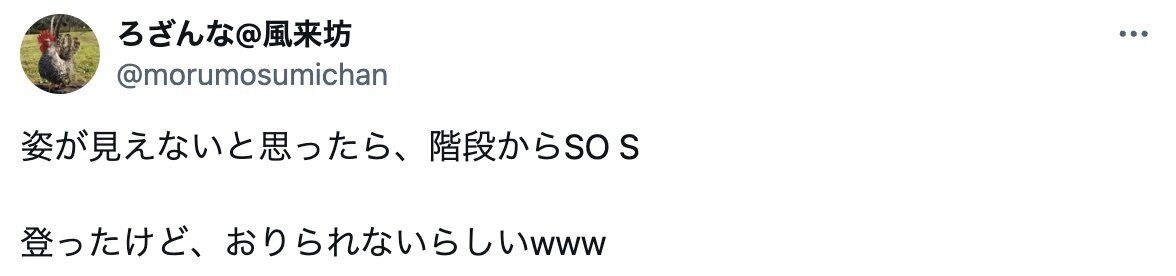 ろざんな@風来坊さん(@morumosumichan)がXに投稿したのは、飼っているチャボのベルボトム(通称ベルオ)くんの写真。階段から降りられなくなってしまい、SOSを出しているベルオくんの様子が「かわいすぎる」と話題になりました。