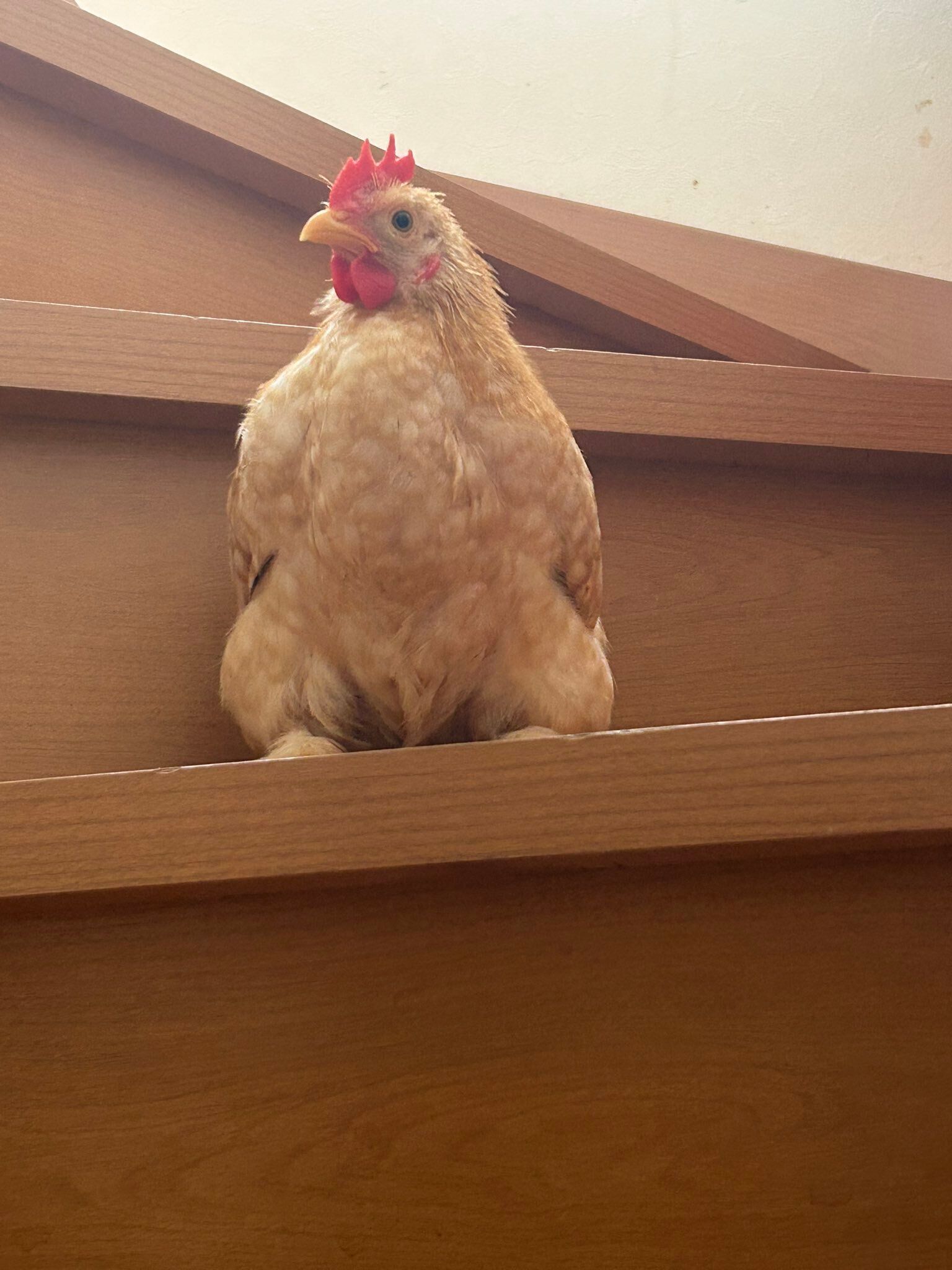 階段を登ったはいいものの、降りられないチャボ!困り果てて飼い主をじっと待つ姿が「かわいすぎる」と4.9万人悶絶
