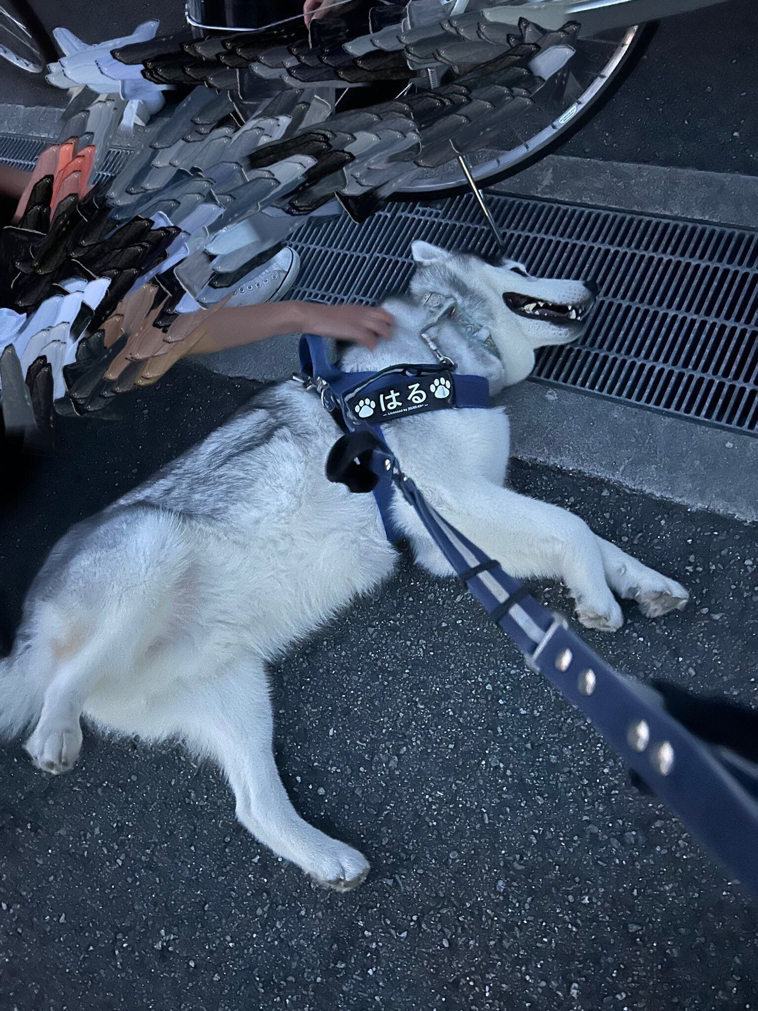 「男子校生がコンビニ横に集まっているところをはると一緒に通り過ぎようとしたとき、一人が『かわいい』と言ってくれたので近寄っていきました。かわいいって言われると、はるはわかるみたいです。一人の子になでてもらうと、次々と耳をペタンコに倒して甘えて行っていました。4人くらいになでてもらうと、次は『お腹もなでて〜』とゴロンしました。かわいがってもらえて満足そうでした」