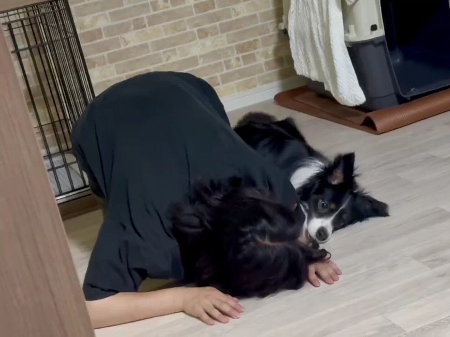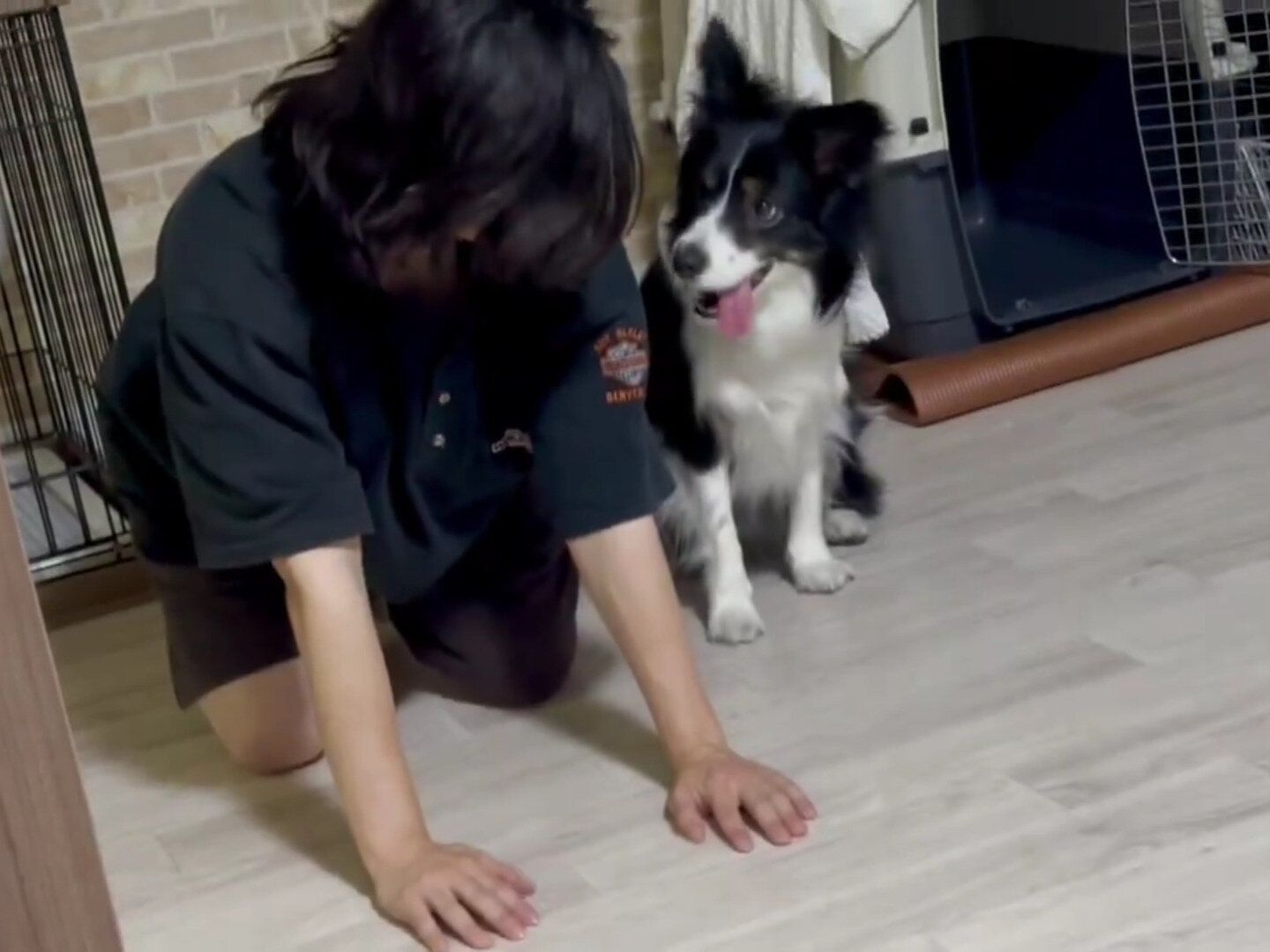 数秒見つめ合ってから、パパは今度は「伏せ」の体勢に。すると、即座にモクちゃんも床に体をつけて「伏せ」をしました。