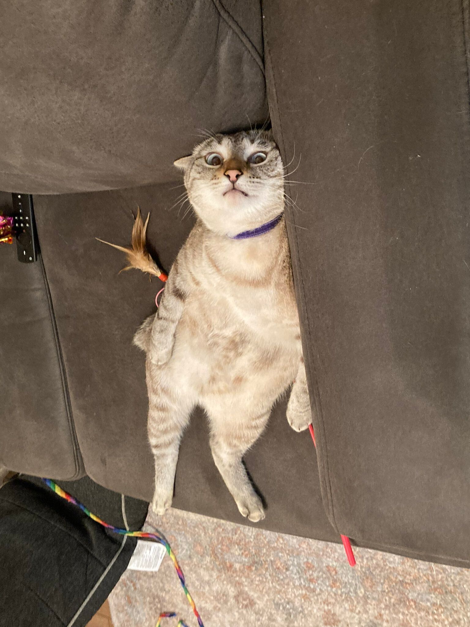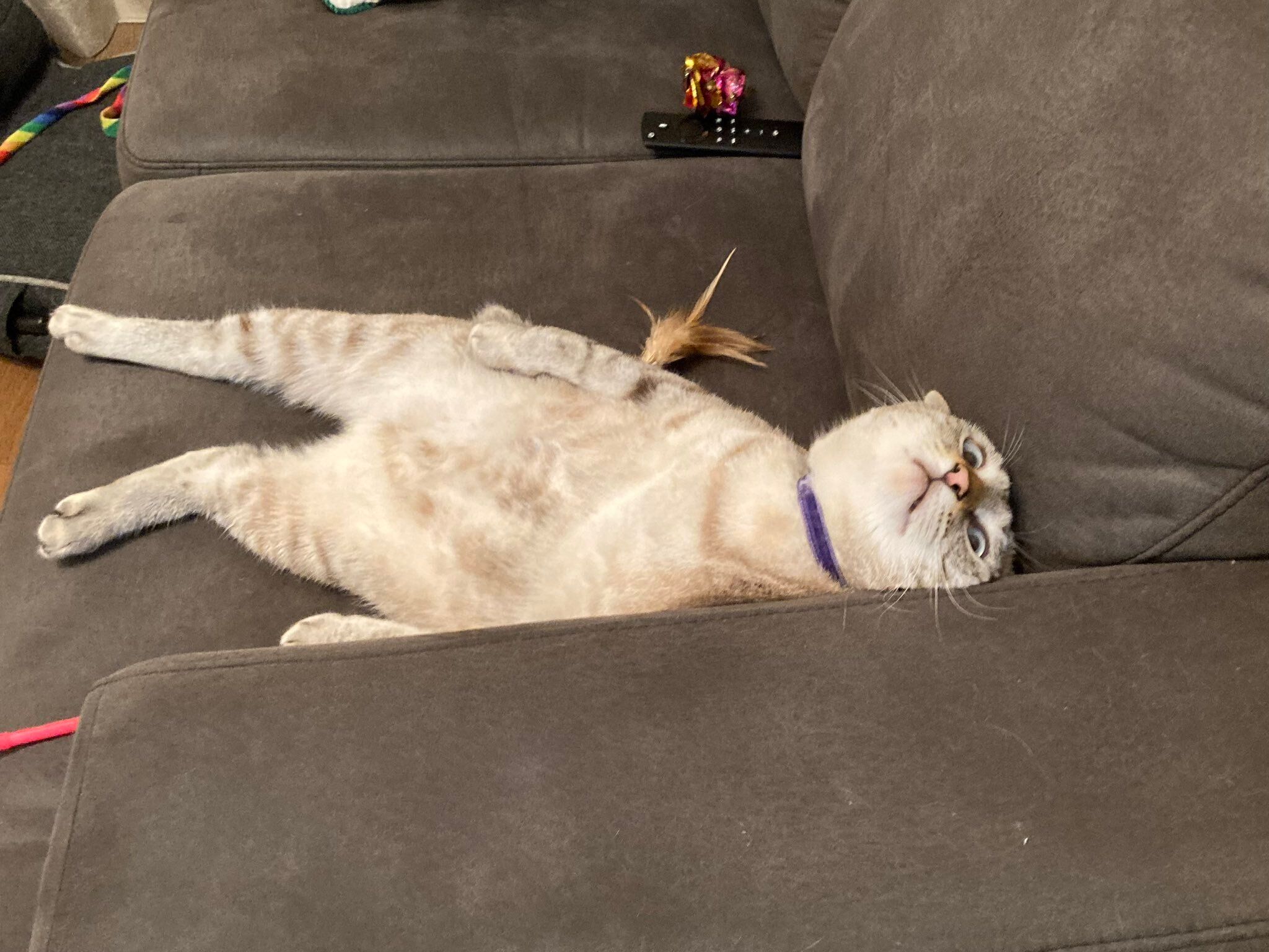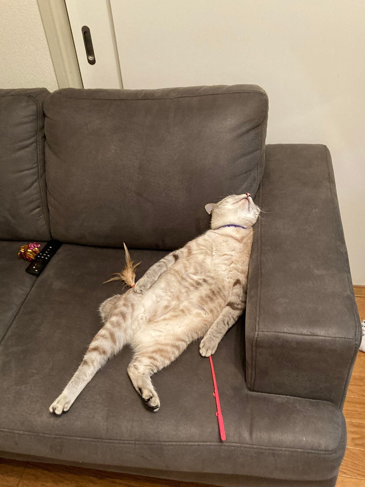 ネコジャラシのおもちゃを体の下に敷いていますが、気にする素振りもまったくありません。